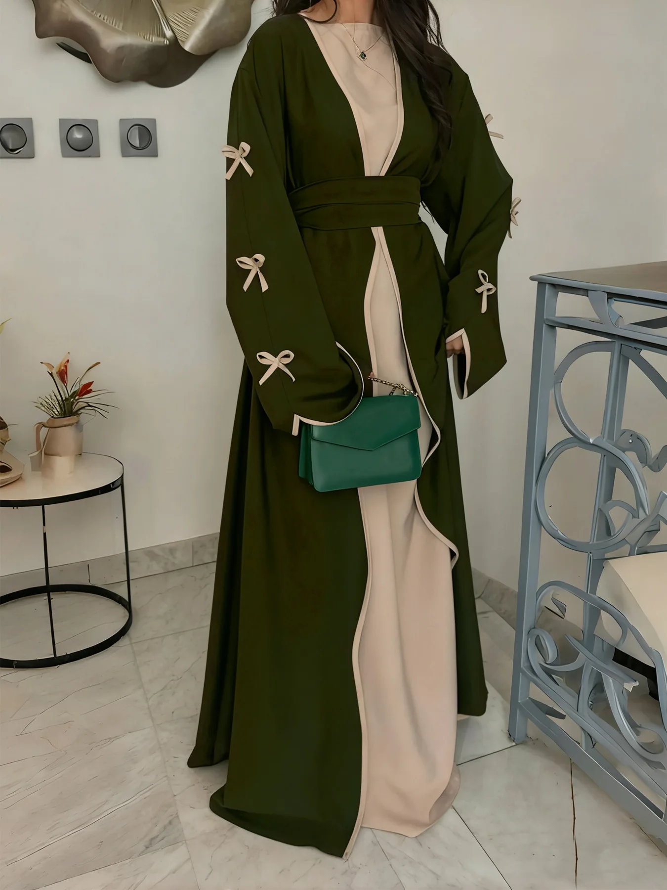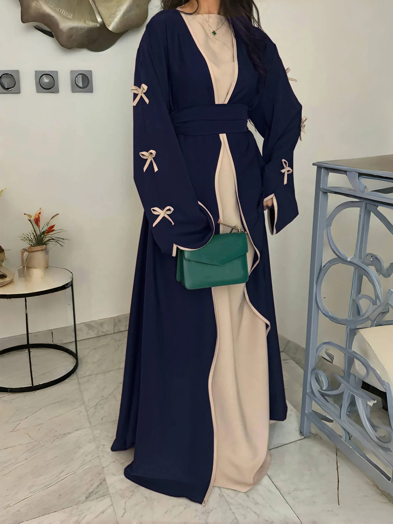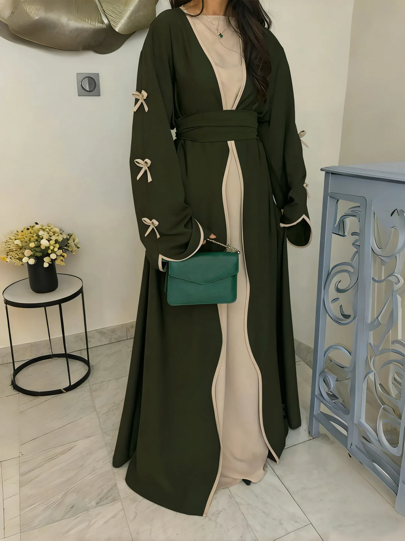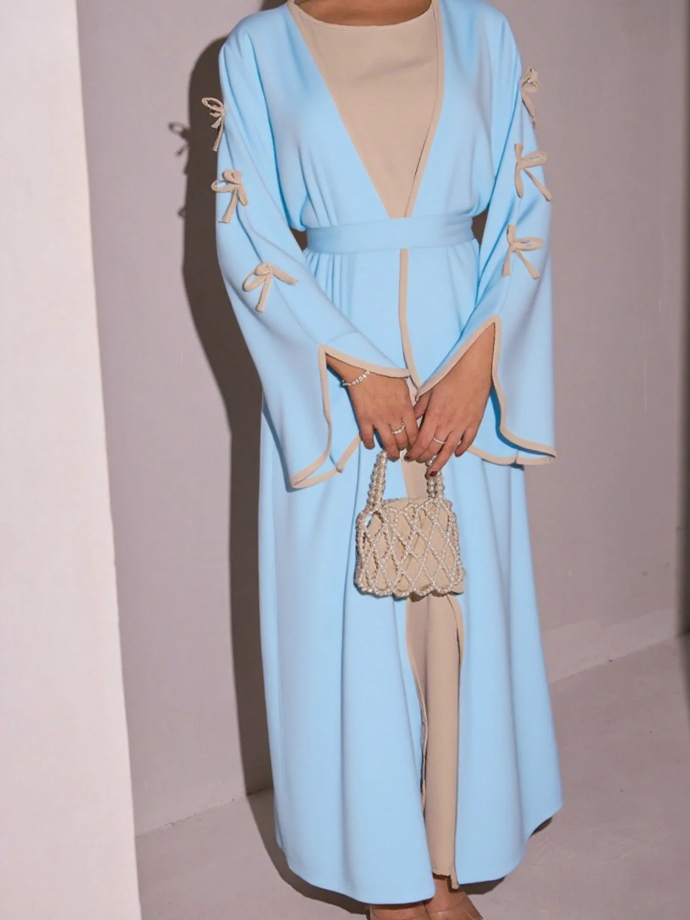 The belted design featuring bow detailing adds a touch of elegance and femininity to this modest dress.