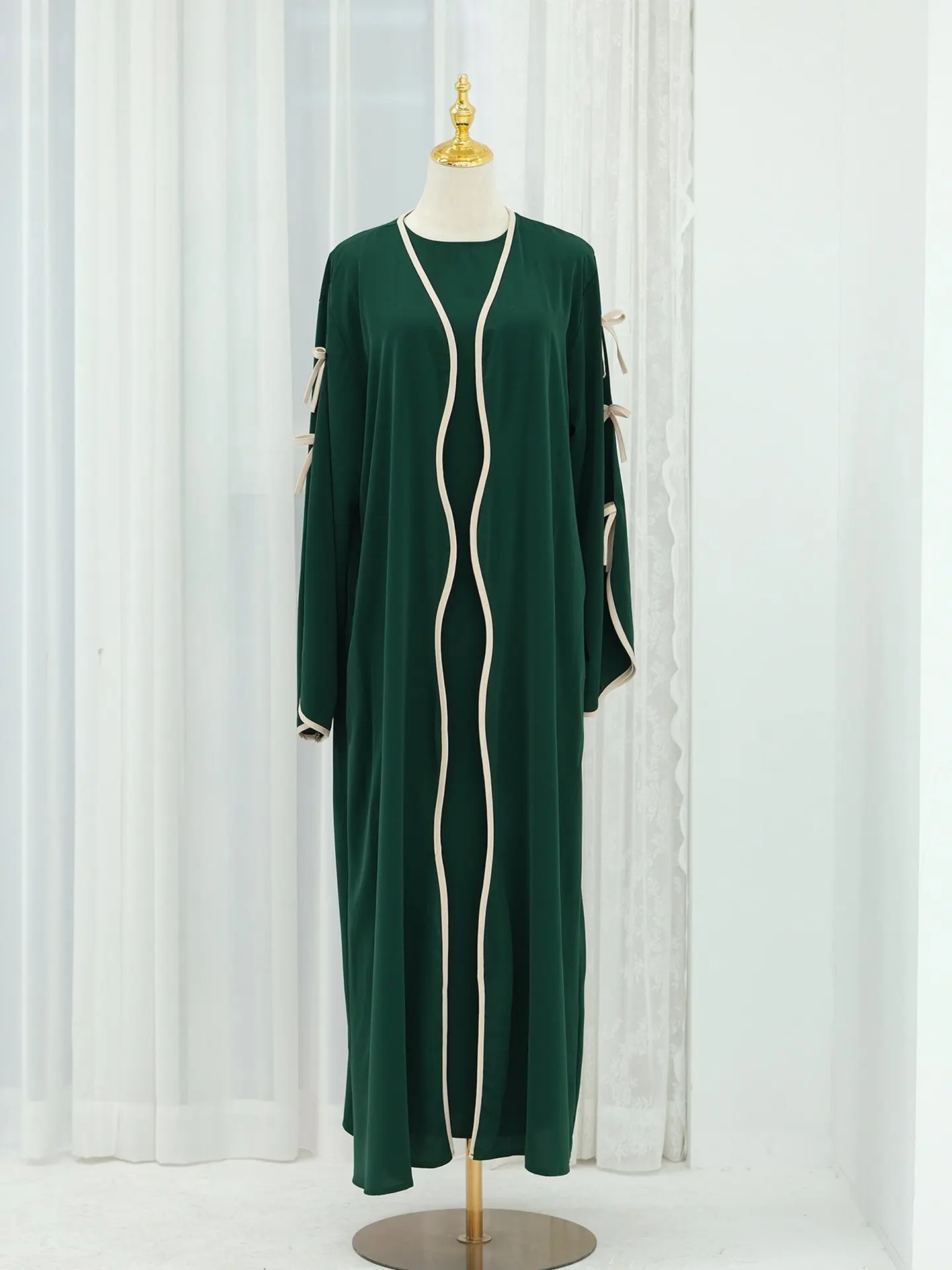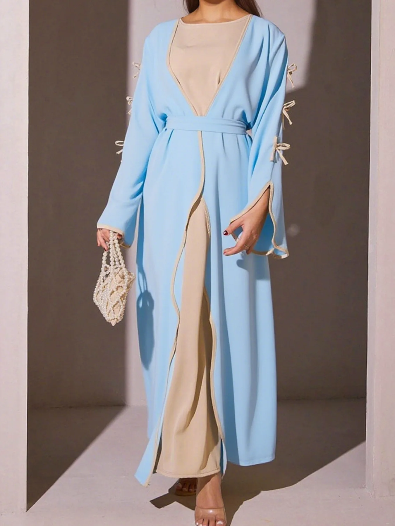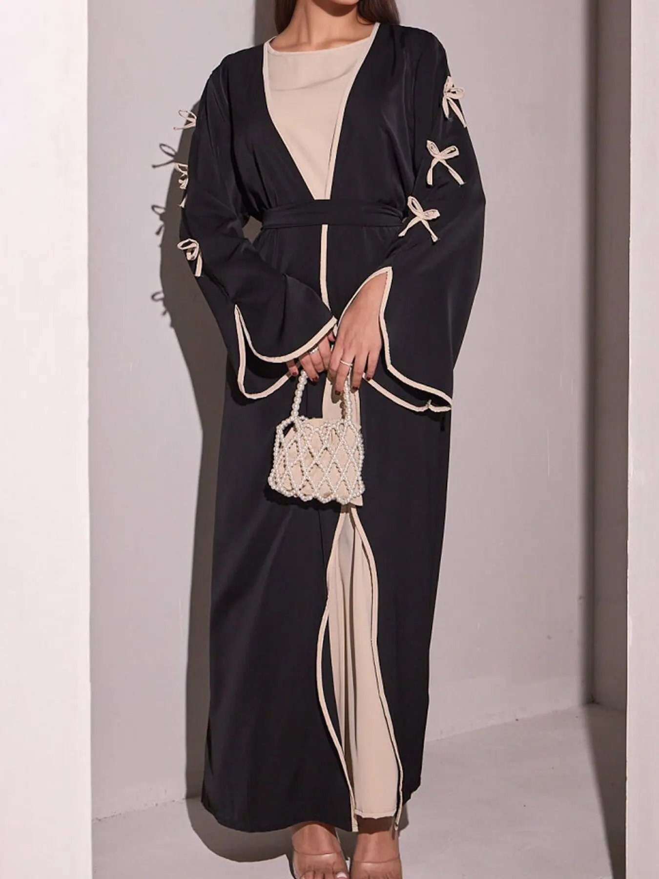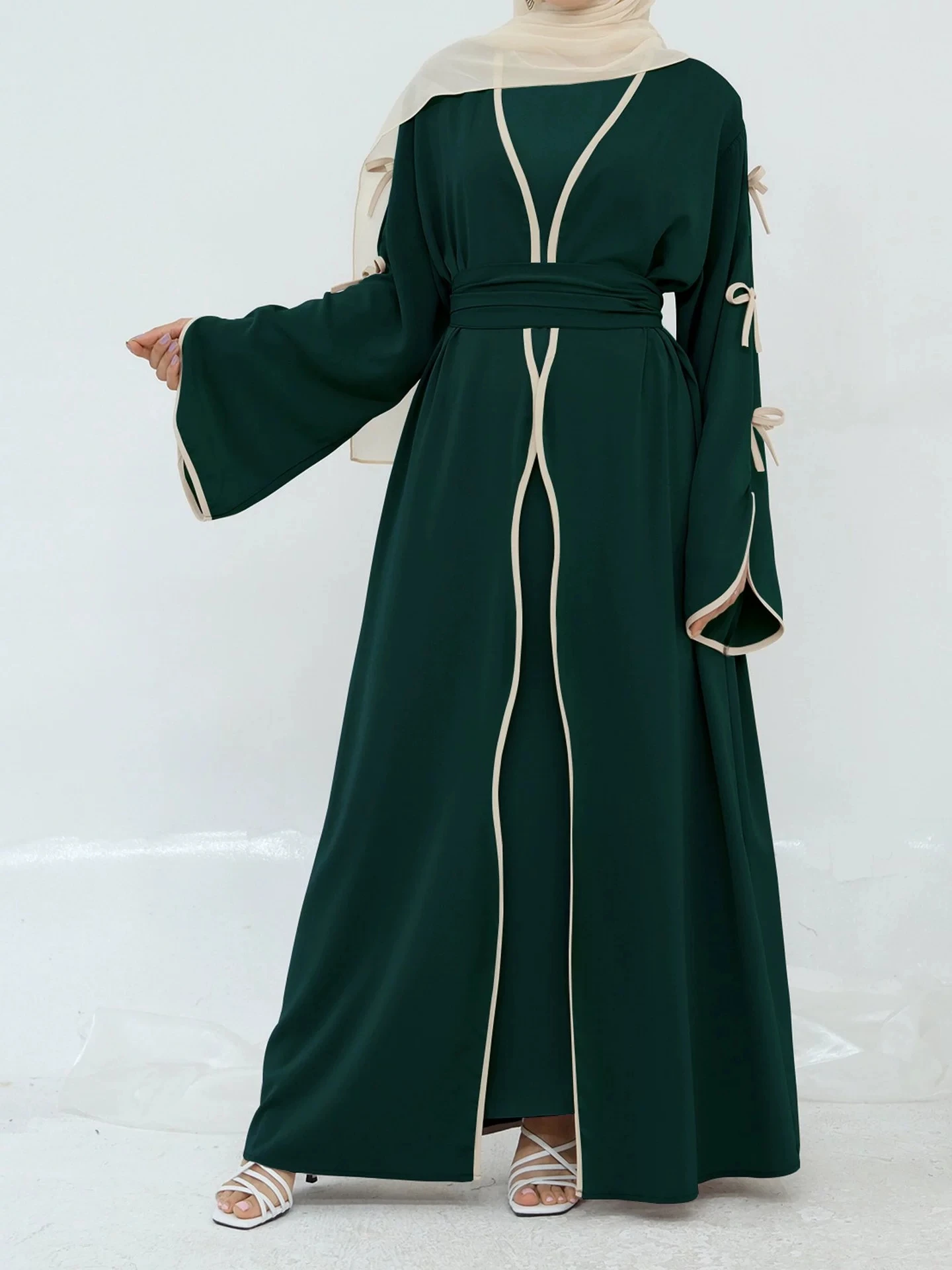 The belted design featuring bow detailing adds a touch of elegance and femininity to this modest dress.
