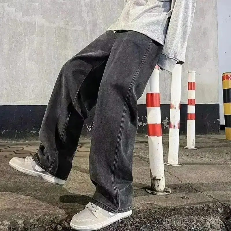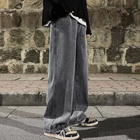 2025 New Korean Men Casual Long Straight Jeans Wide Leg Denim Pants Solid Color Light Blue Grey Black