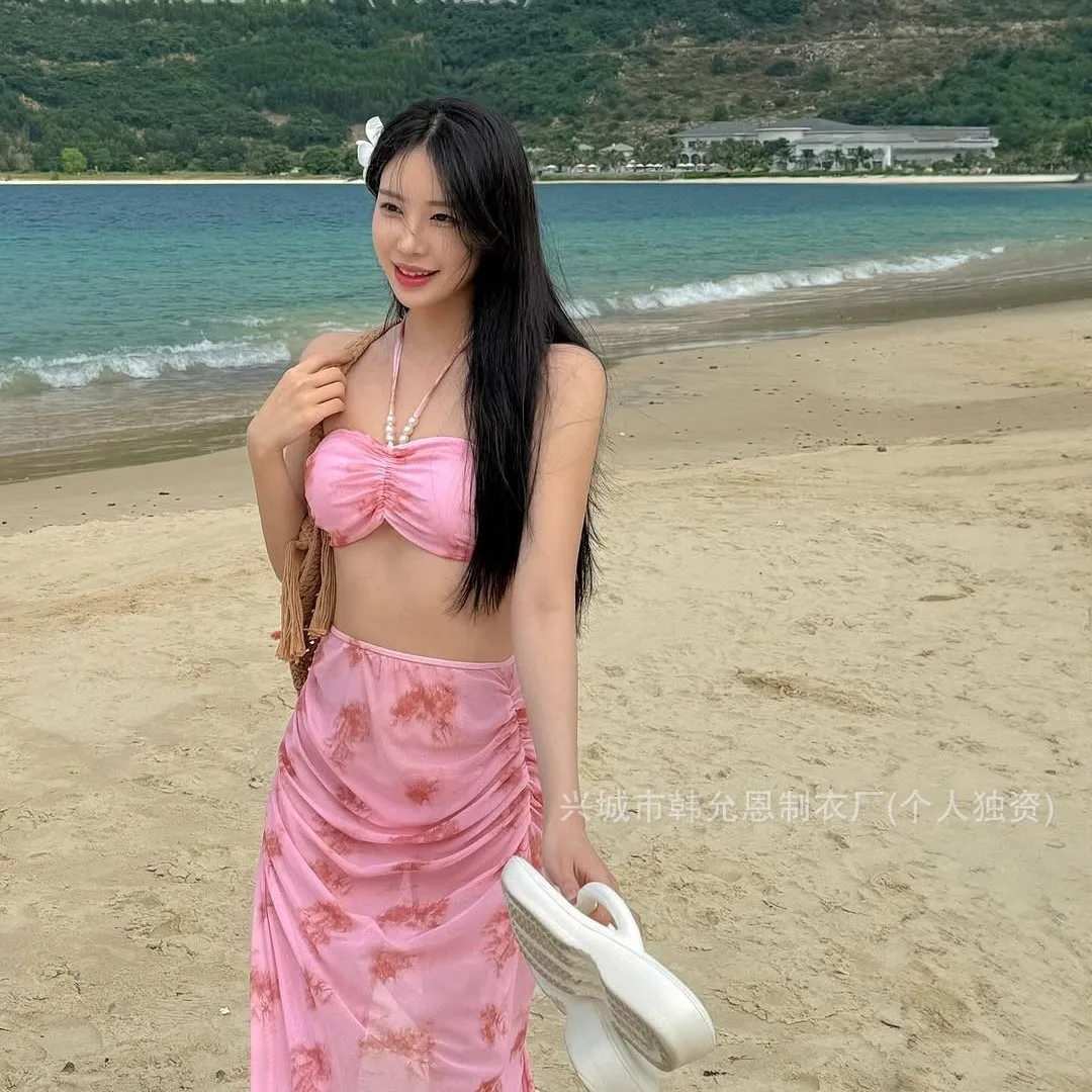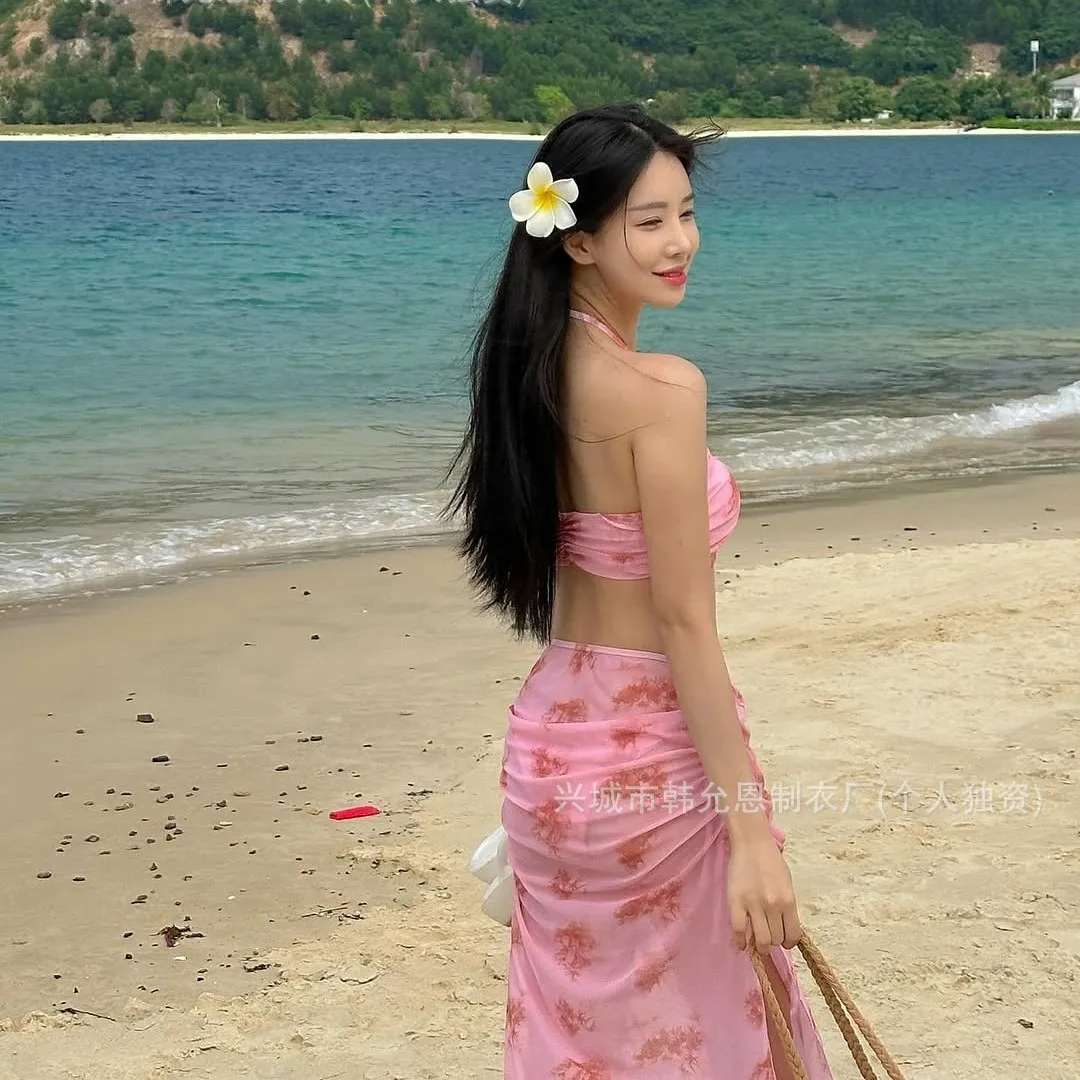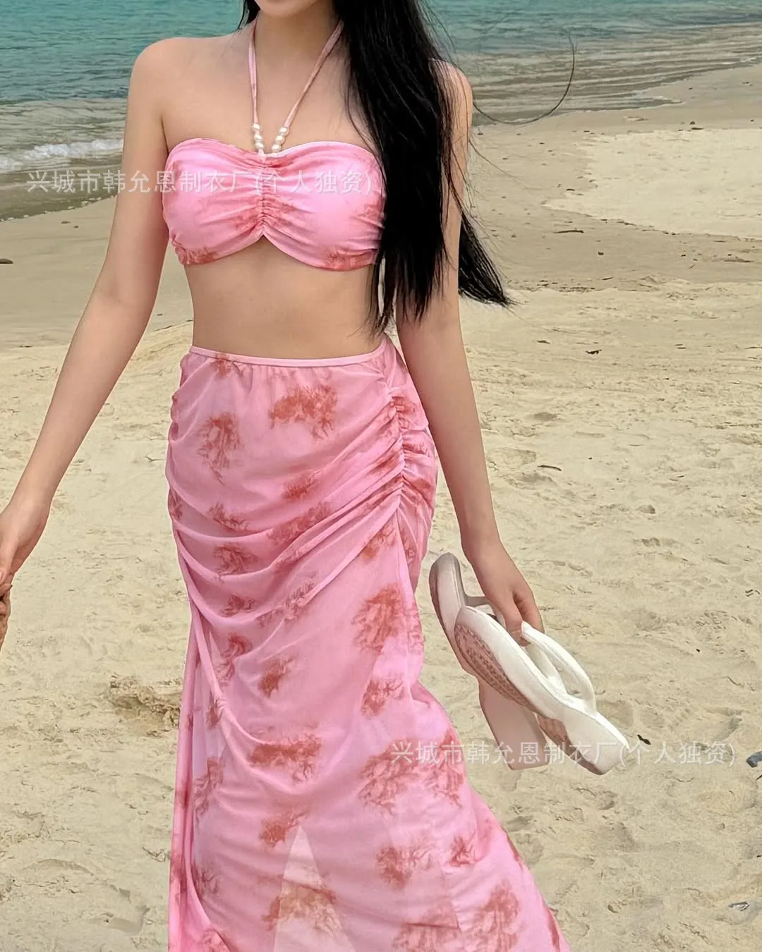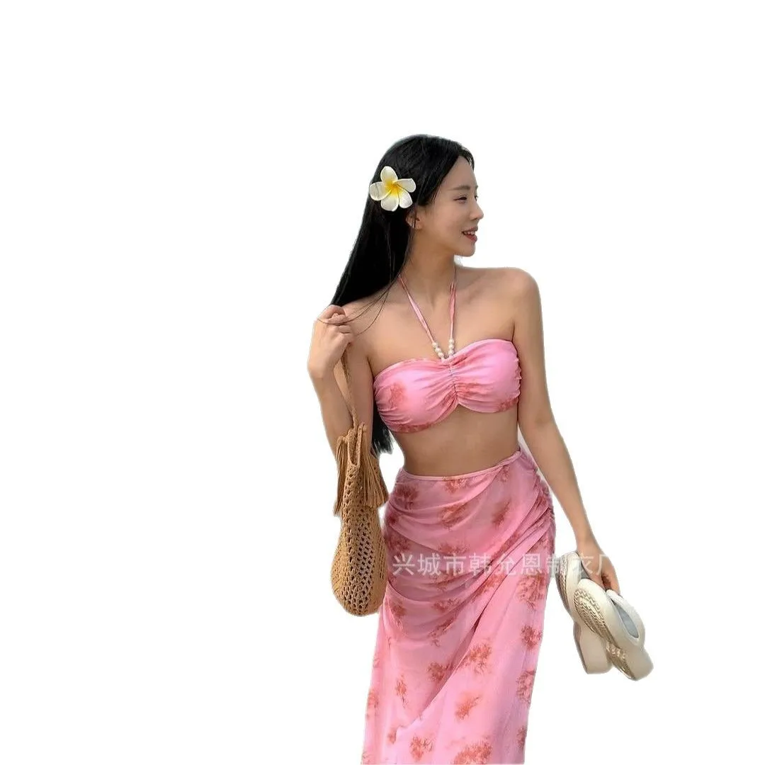 2025 New Style Floral Gradient Bikini Long Dress Sexy Swimming Suit Slimming Belly Cover Small Chest Hot Spring Swimwear Women