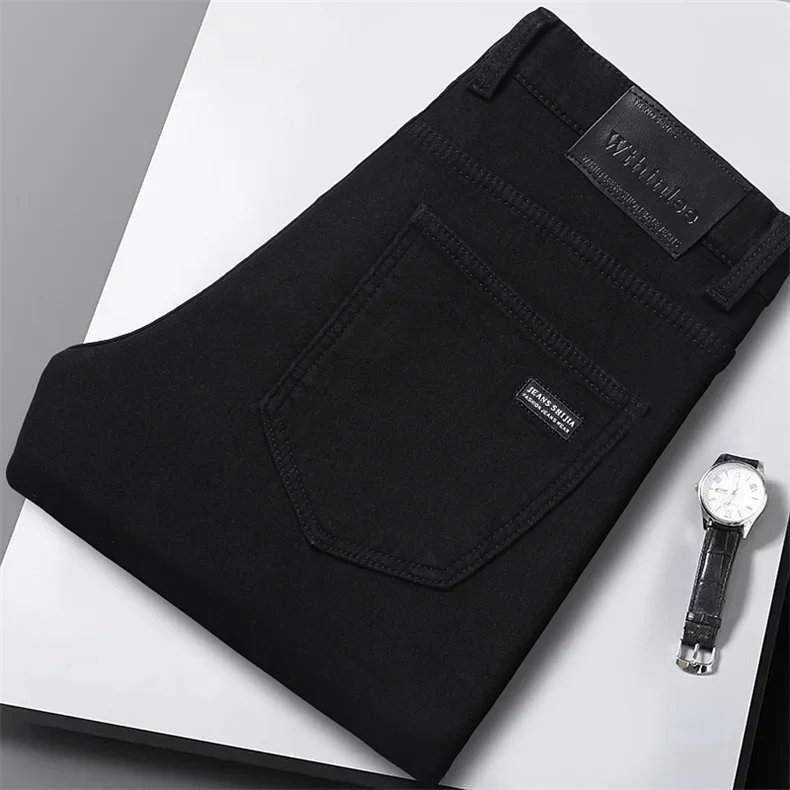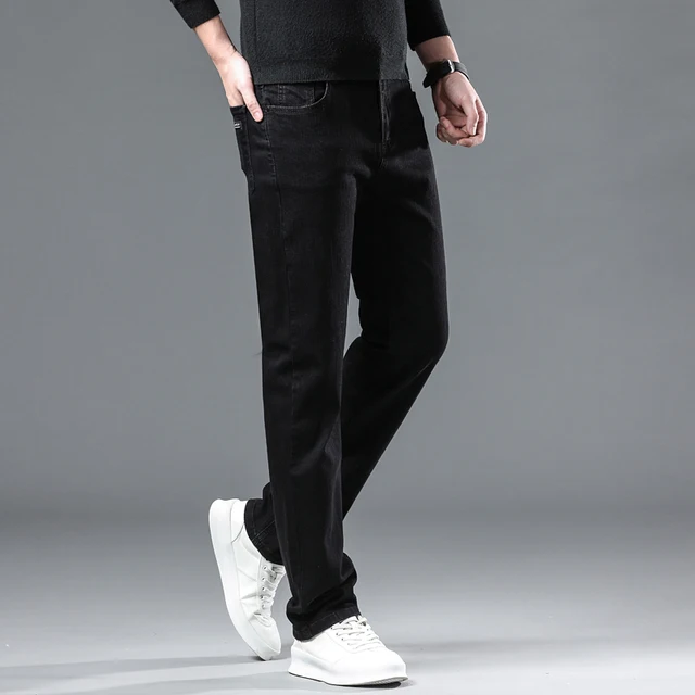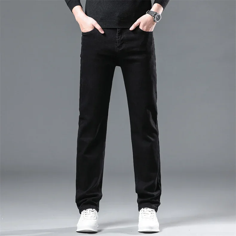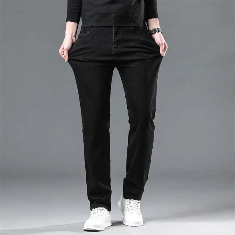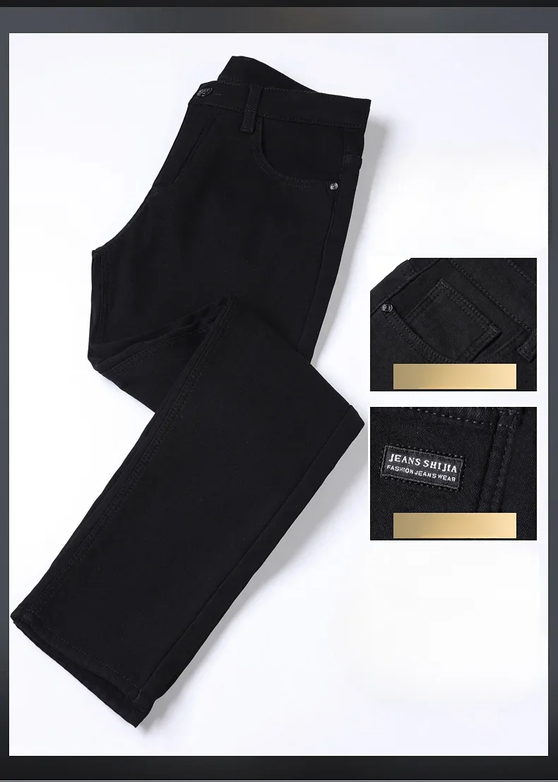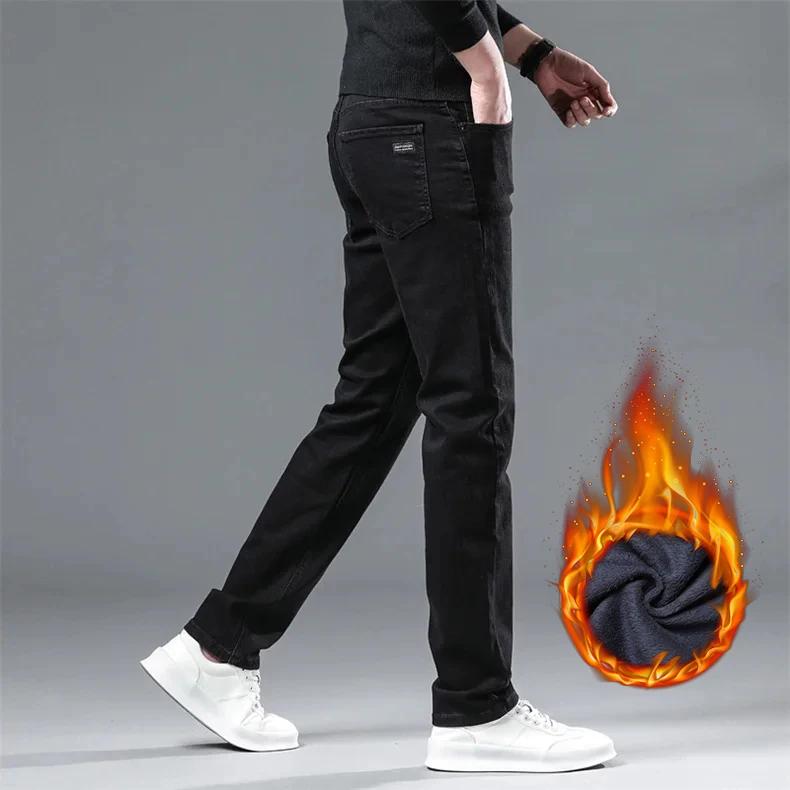 2025 New Thick Fleece Men’s Stretch Jeans Winter Thermal Warm Straight Casual Denim Trousers Black
