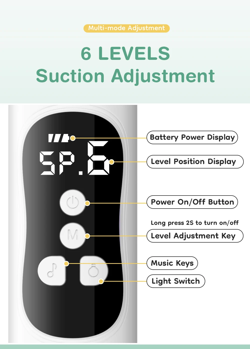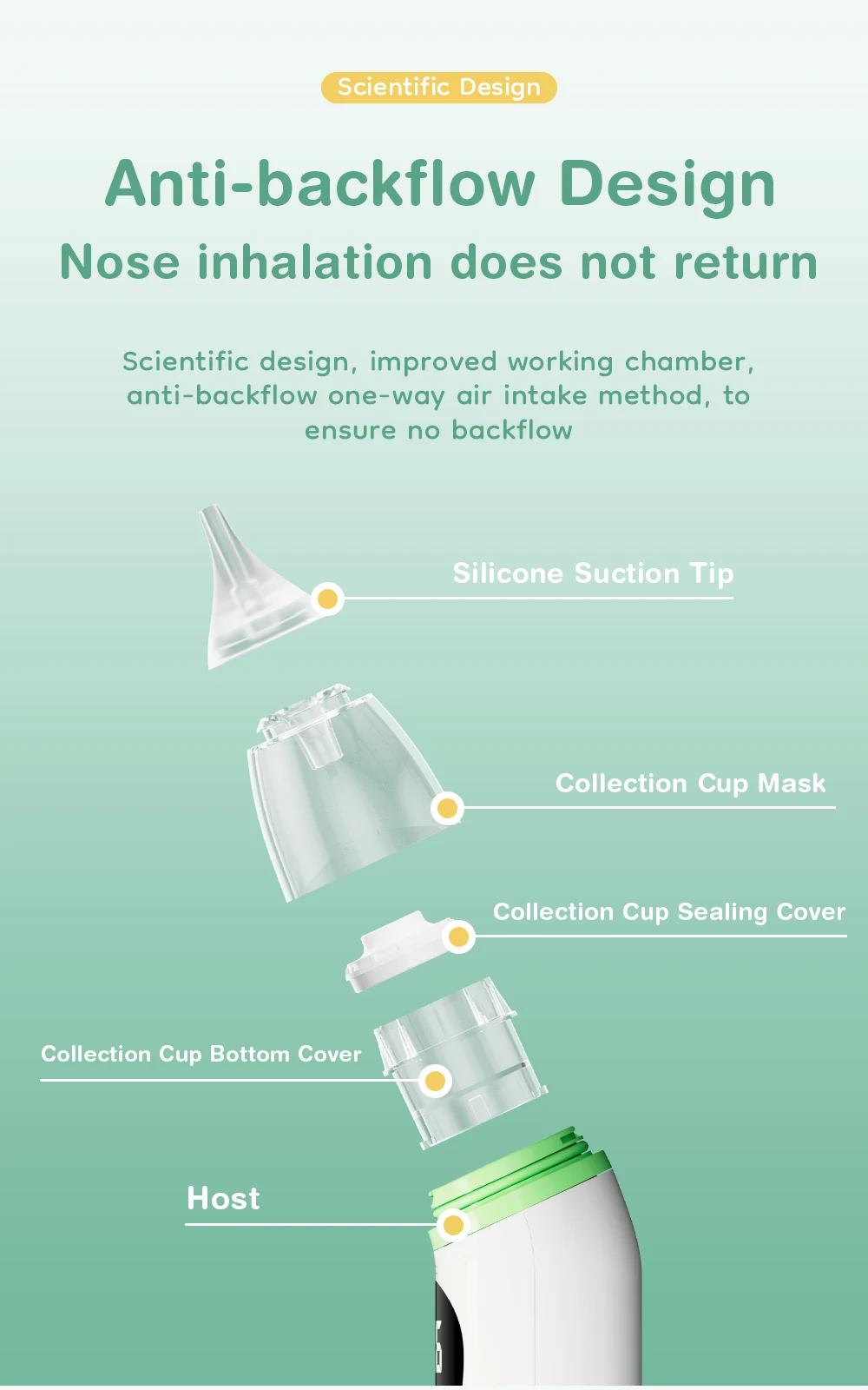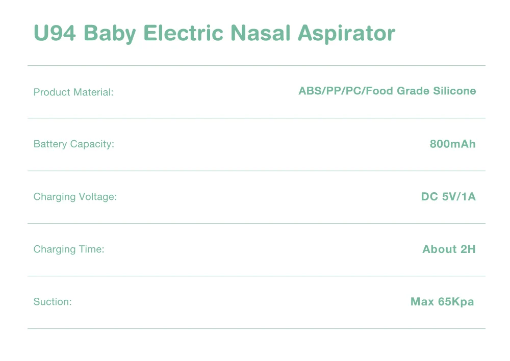 【Strong Suction】 The strong suction of baby nasal aspirator is up to 65Kpa. There 4 modes of suction can be adjusted, which can resolve almost all kinds of snot. (TIP:For stubborn boogers and mucus, soften with Saline Snot Spray first, please wait for 30 seconds to one minute, then suck away with this Baby Nose Sucker)