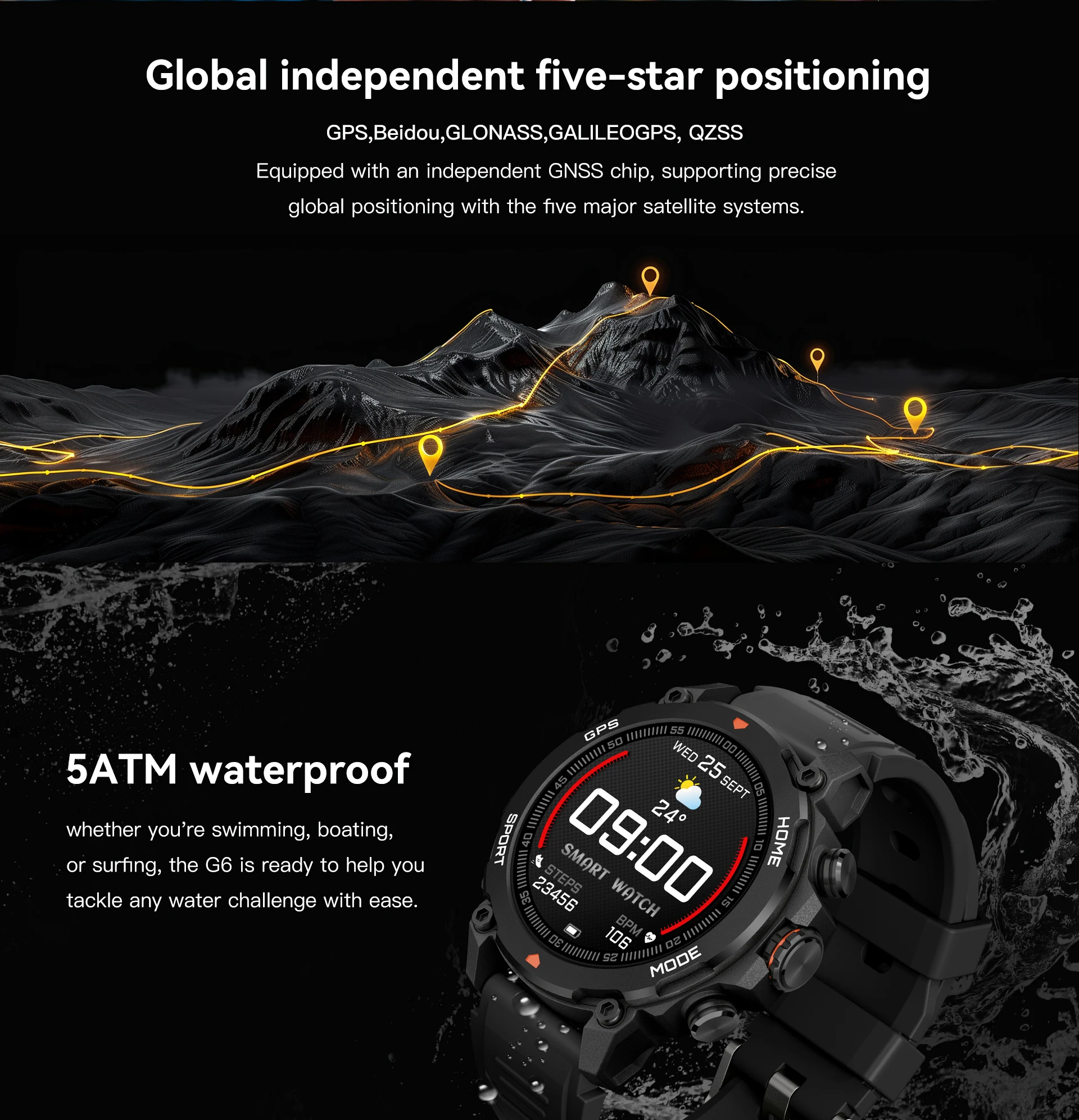 【Advanced Navigation Tools】Navigate confidently with the integrated altimeter, barometer, and compass. These tools provide essential data for outdoor exploration, ensuring you stay on course and informed about your environment. Whether climbing a mountain or exploring off-road trails, the G6 keeps you equipped for every journey.