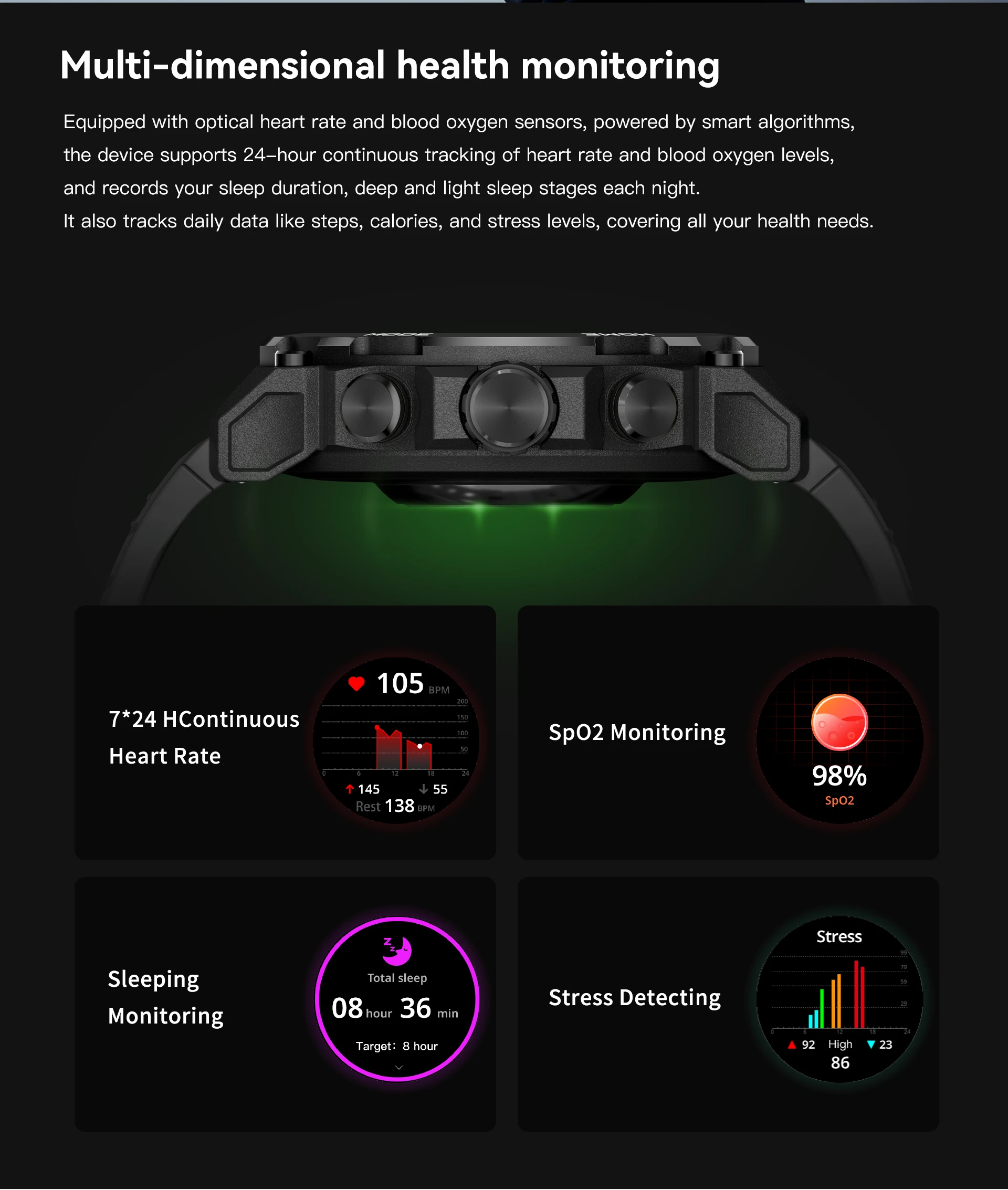 【Full-Featured Fitness Tracking】Stay on top of your fitness with 24-hour tracking of wellness indicators and sleep quality. The G12 provides detailed insights into your fitness and daily activity levels and real-time insights, with customizable notifications and comprehensive data analysis via the mobile app, empowering you to enhance your fitness and lifestyle choices. It also supports female menstrual cycle tracking for comprehensive wellness management.