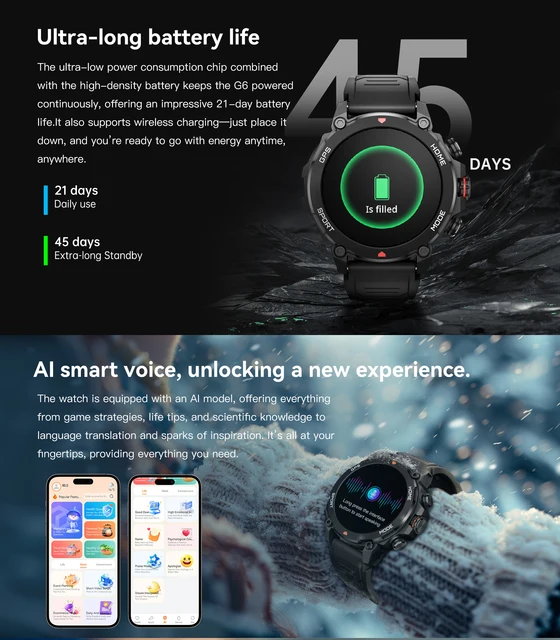 【AI Voice Assistant & Bluetooth Connectivity】Enhance convenience and safety with effortless voice commands on the G6. Manage calls, set alarms, control music, check the weather, and access fitness data hands-free, keeping you focused during workouts or daily tasks. Make calls, check the weather, or navigate effortlessly using Bluetooth 5.3 connectivity. The smartwatch also supports seamless notifications from almost all popular apps, ensuring you stay connected without reaching your phone.