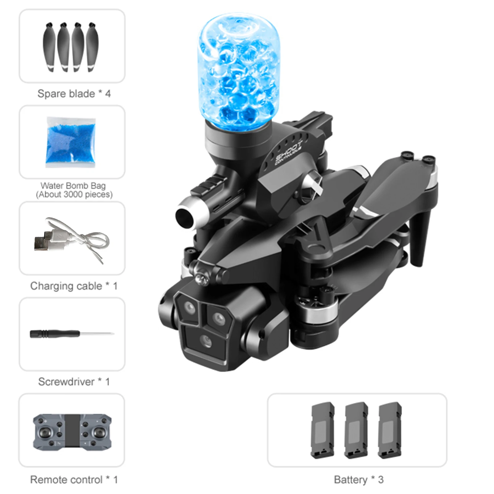 Function: Water Bombs Launching, Four-way Obstacle Avoidance, Optical Flow Positioning, Mobile Phone Control, High Clarity Image Transmission