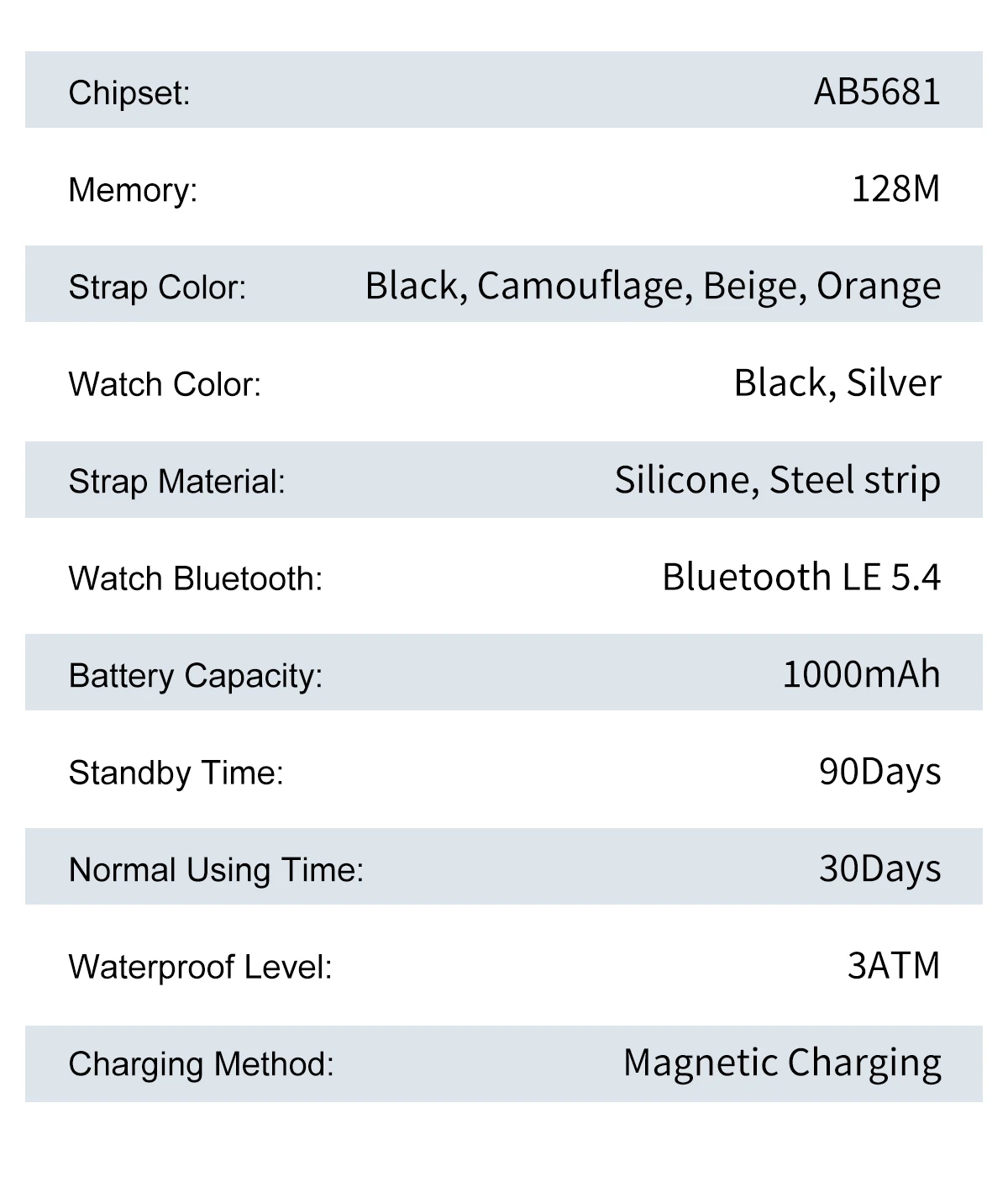 Flashlight, Bluetooth calling, dial market, QR code connection, multiple UI menus, voice calling, OTA upgrade, step counting, calories, exercise mode, hand up screen, sleep monitoring, call reminder, message reminder, sedentary reminder, alarm reminder, stopwatch, dial switching, 3D dynamic dial, music playback, respiratory training, hourly measurement, heart rate, blood pressure, blood oxygen, calculator, custom dial, brightness adjustment, weather, independent alarm clock, exercise trajectory, game and other new functions, settings, brightness adjustment, power-saving mode, do not disturb mode, voice assisted hand