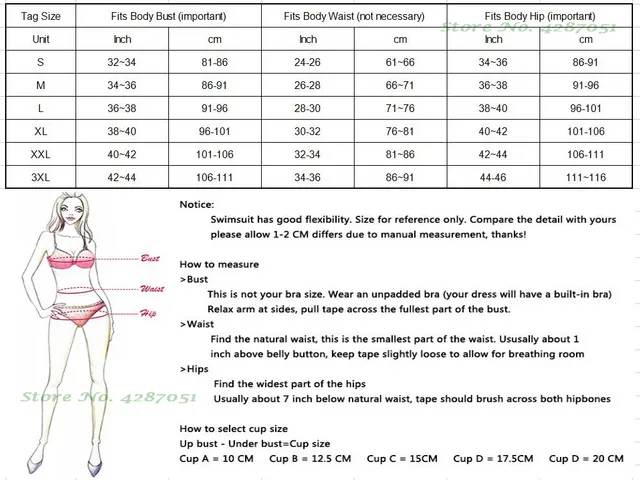 To make it easier for you to choose the size, this is a table for body measurement, not for swimsuits measurement. Please measure your bust and hip, compare your measurements to the size chart, get the closest size, if not so close to the size, choose smaller size due to our swimsuits are in high stretchy, tight is better than loose.