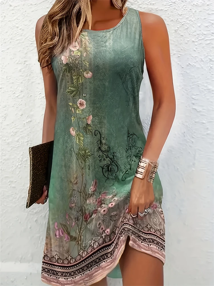 2025 Summer Women’s Knee Length Short Dress Bohemian Vintage Printed Round Neck Dress Casual Comfortable