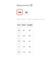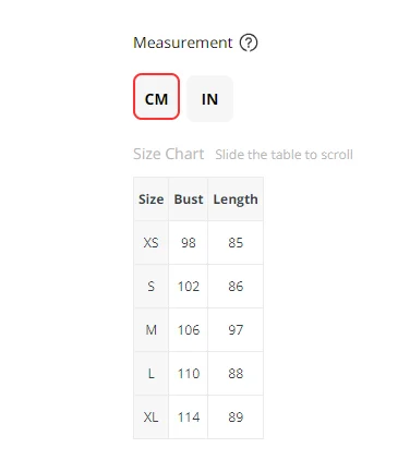 | size_info | {"sizeInfoList":[{"length":{"cm":"98","inch":"38.58"},"size":"XS","vid":-1},{"length":{"cm":"102","inch":"40.16"},"size":"S","vid":-2},{"length":{"cm":"106","inch":"41.73"},"size":"M","vid":-3},{"length":{"cm":"110","inch":"43.31"},"size":"L","vid":-4},{"length":{"cm":"114","inch":"44.88"},"size":"XL","vid":-13}]} |