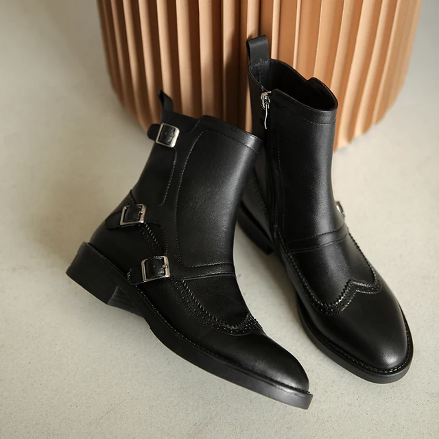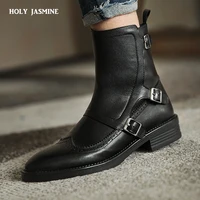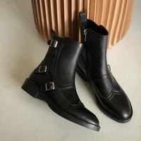 2026 Autumn New Woman Buckle Chelsea Boots Handmade Genuine Leather Round Toe Shoes Quality Buckle Square