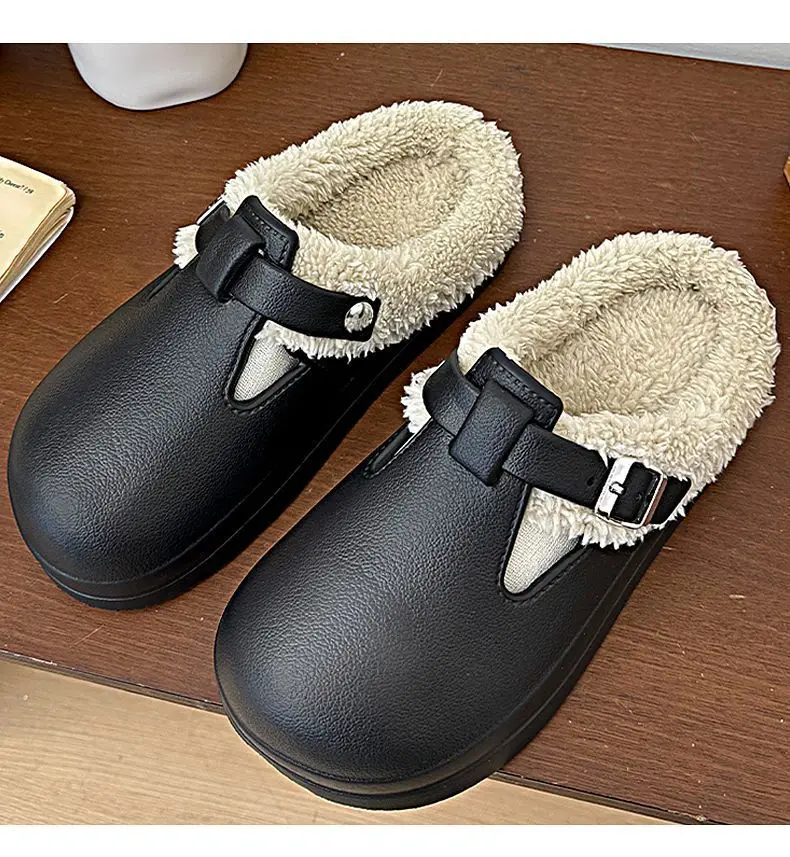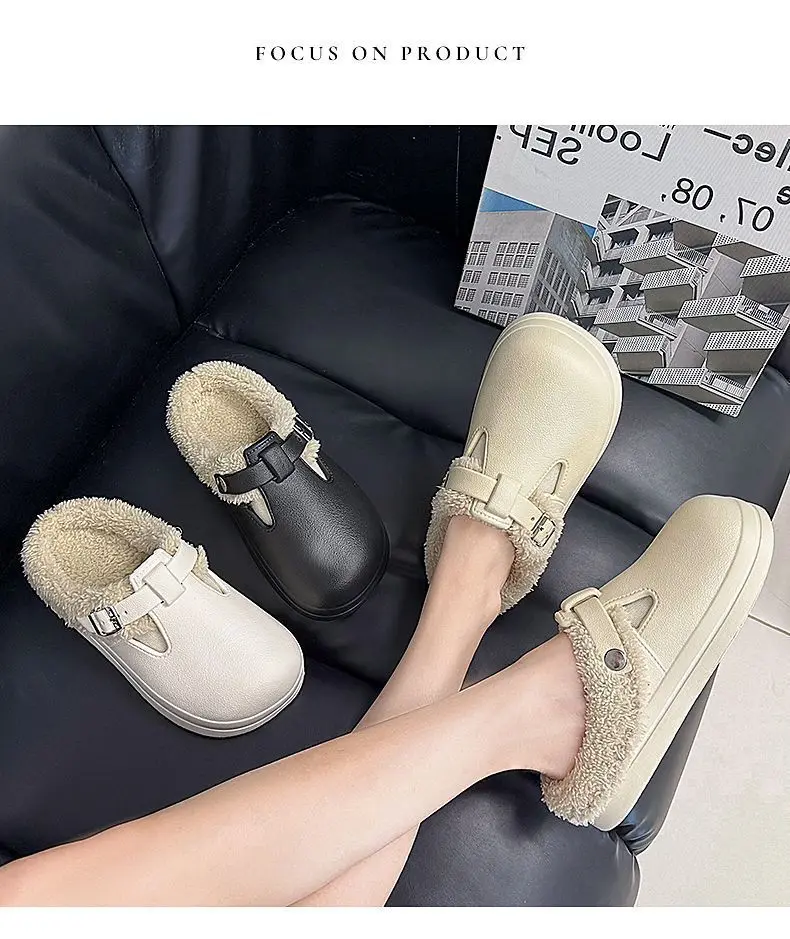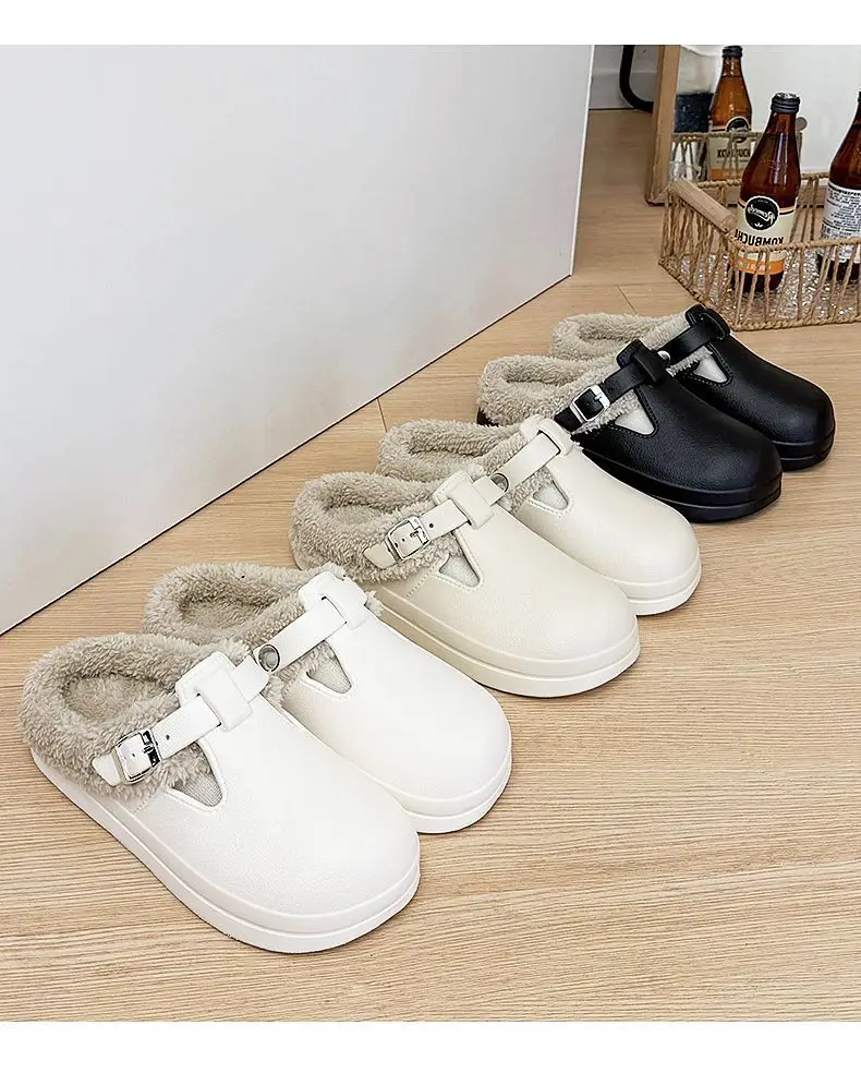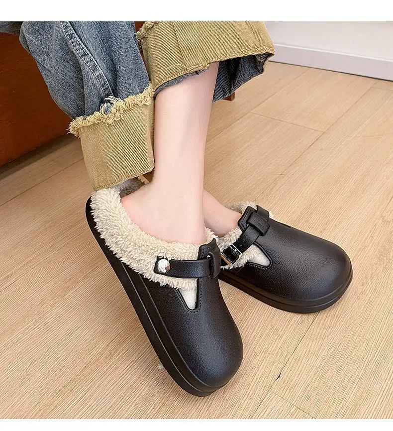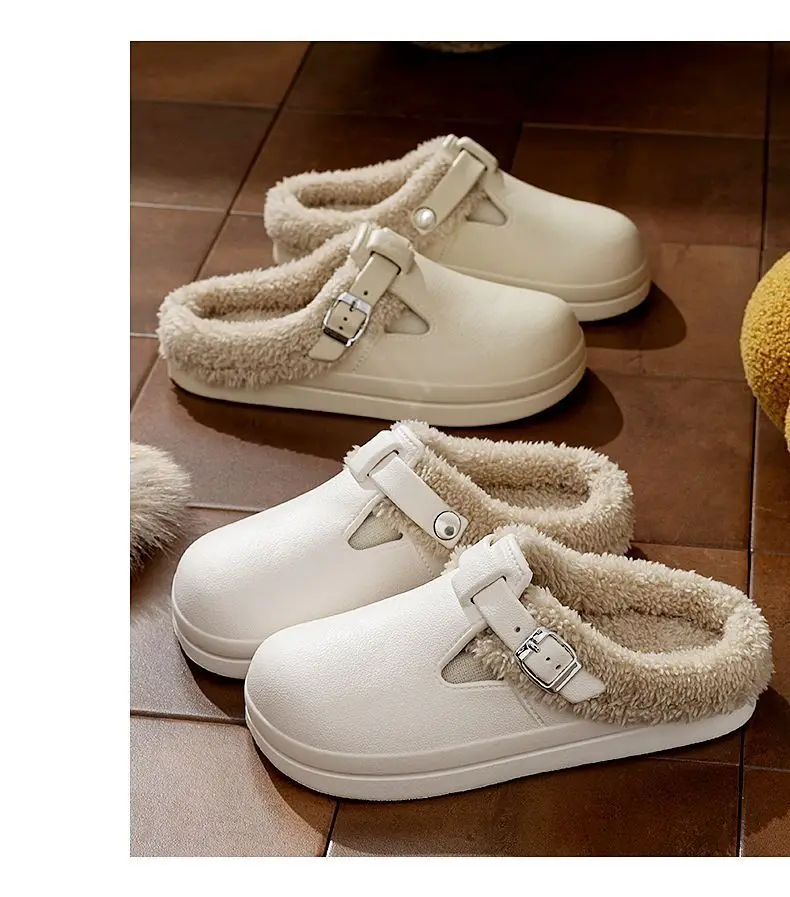 2026 Women’s Winter Waterproof EVA Slippers - Warm Plush Furry Mules, Non Slip Thick Bottom Metal Buckle Indoor Slides