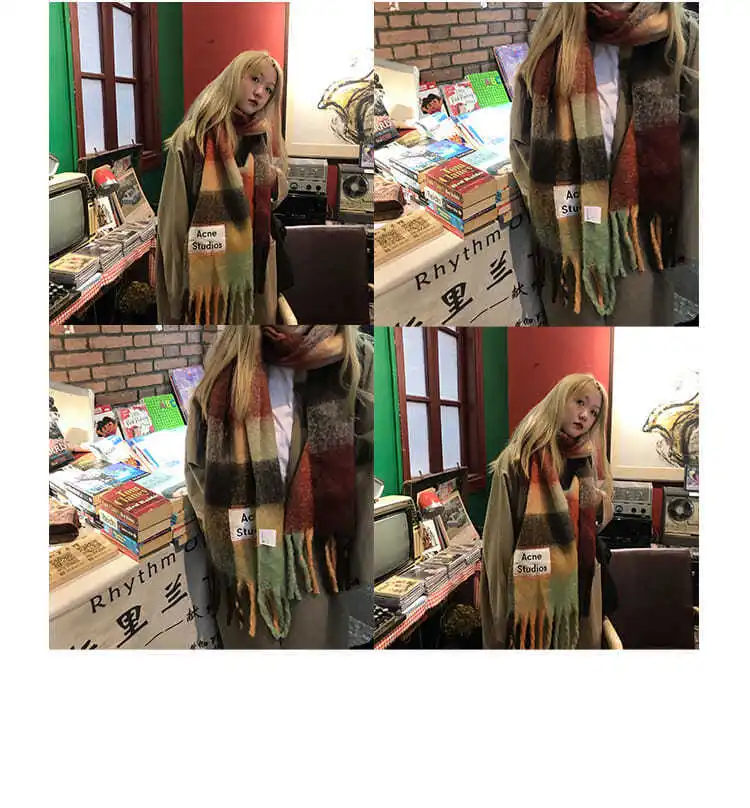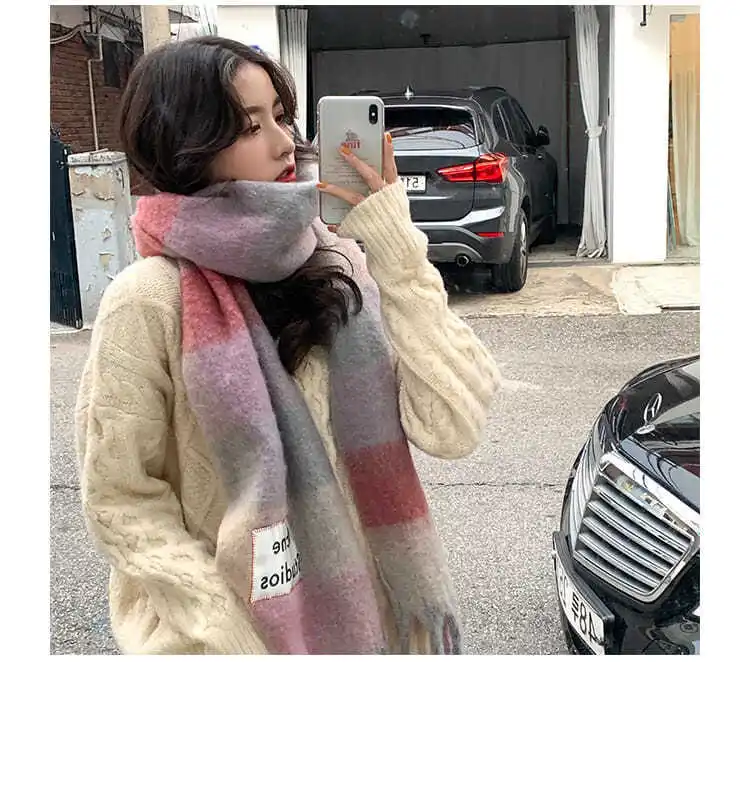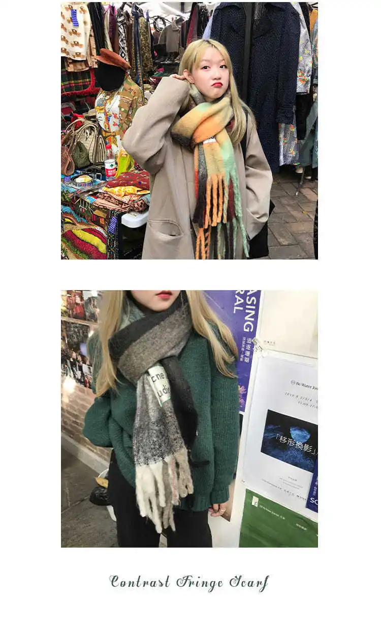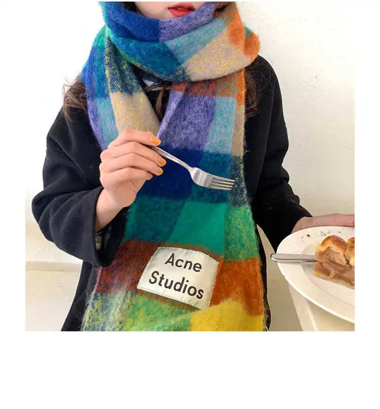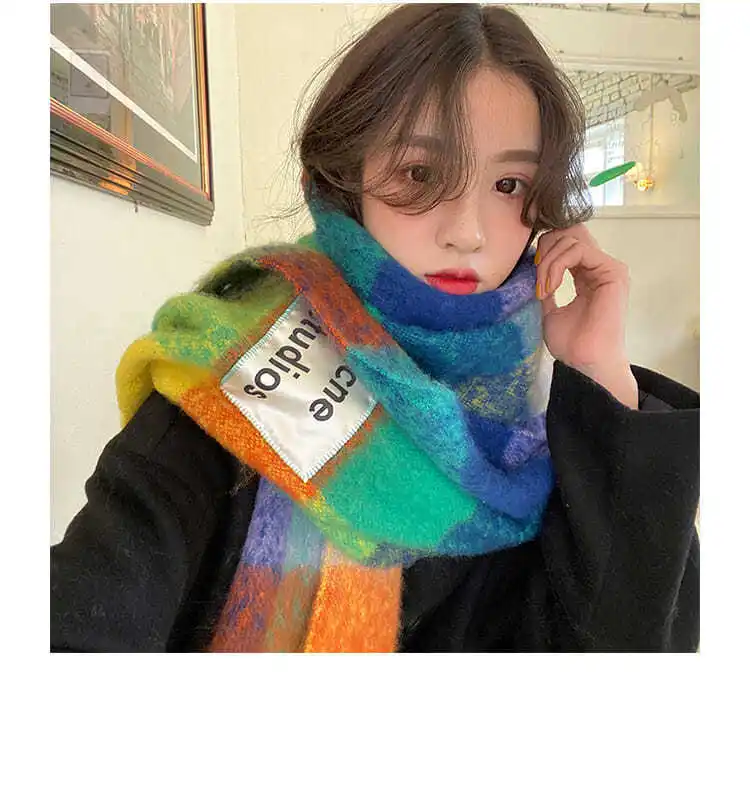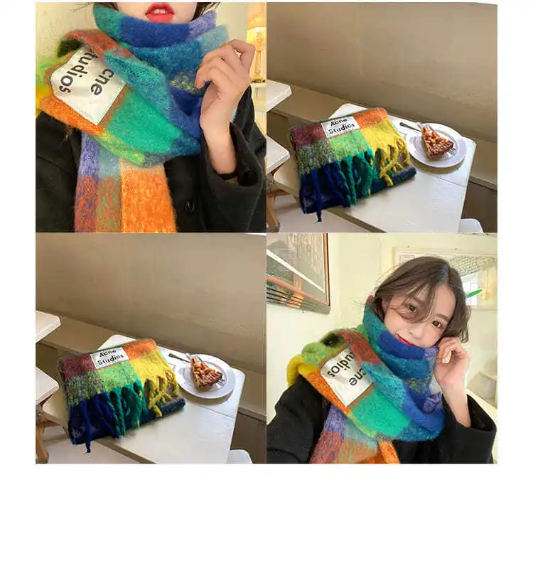 2026Korean version rainbow fringe square couple shawl with contrasting colors, warm scarf, women's winter versatile scarf
