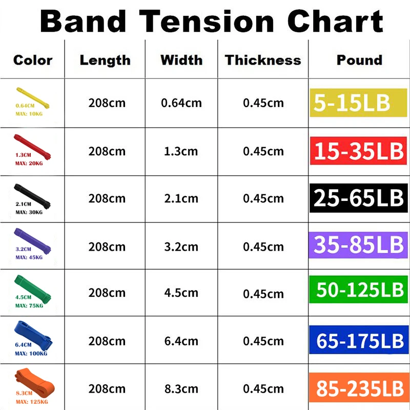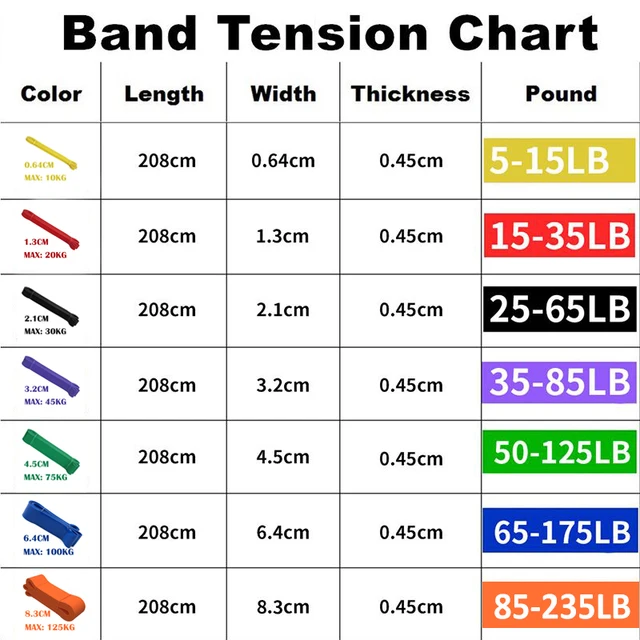 Yellow(5-15 lbs), Best for speed barbell training and shoulder mobility. Red(15-35 lbs), Beginning bands for resistance and barbell band training or just a little boost for pull up assist.