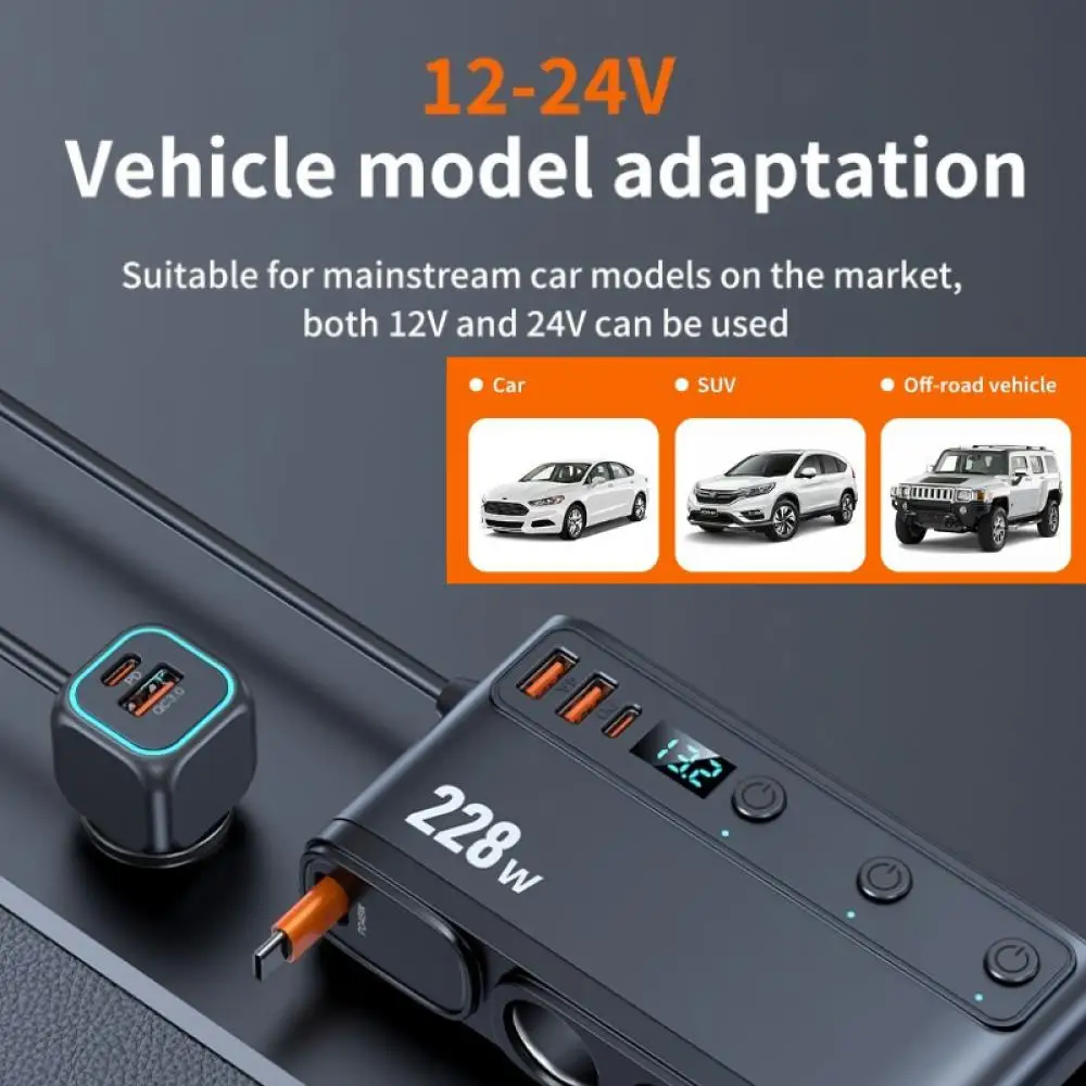 228W Car Charger Adapter 9 in 1 PD 3 Socket Cigarette Lighter Splitter Charge Independent Switches 12V 24V Fast Charger