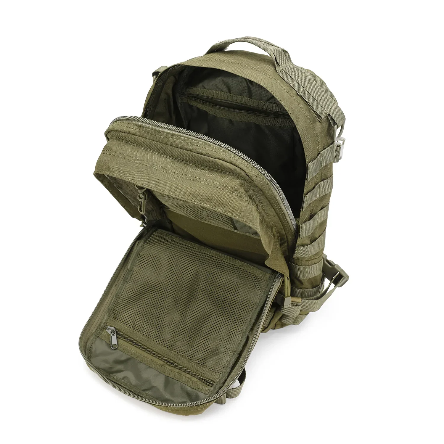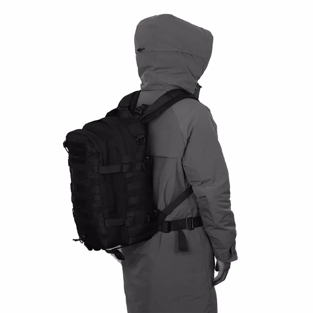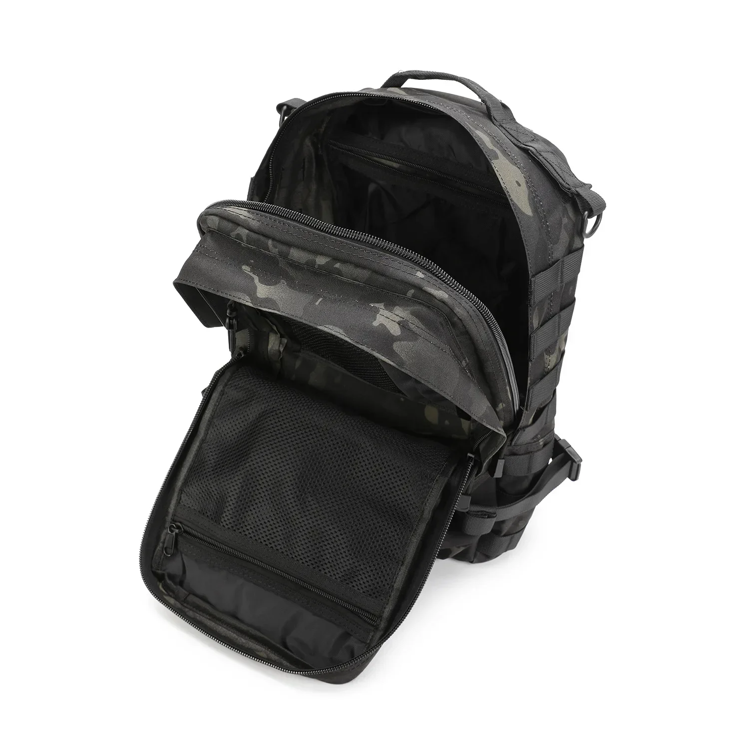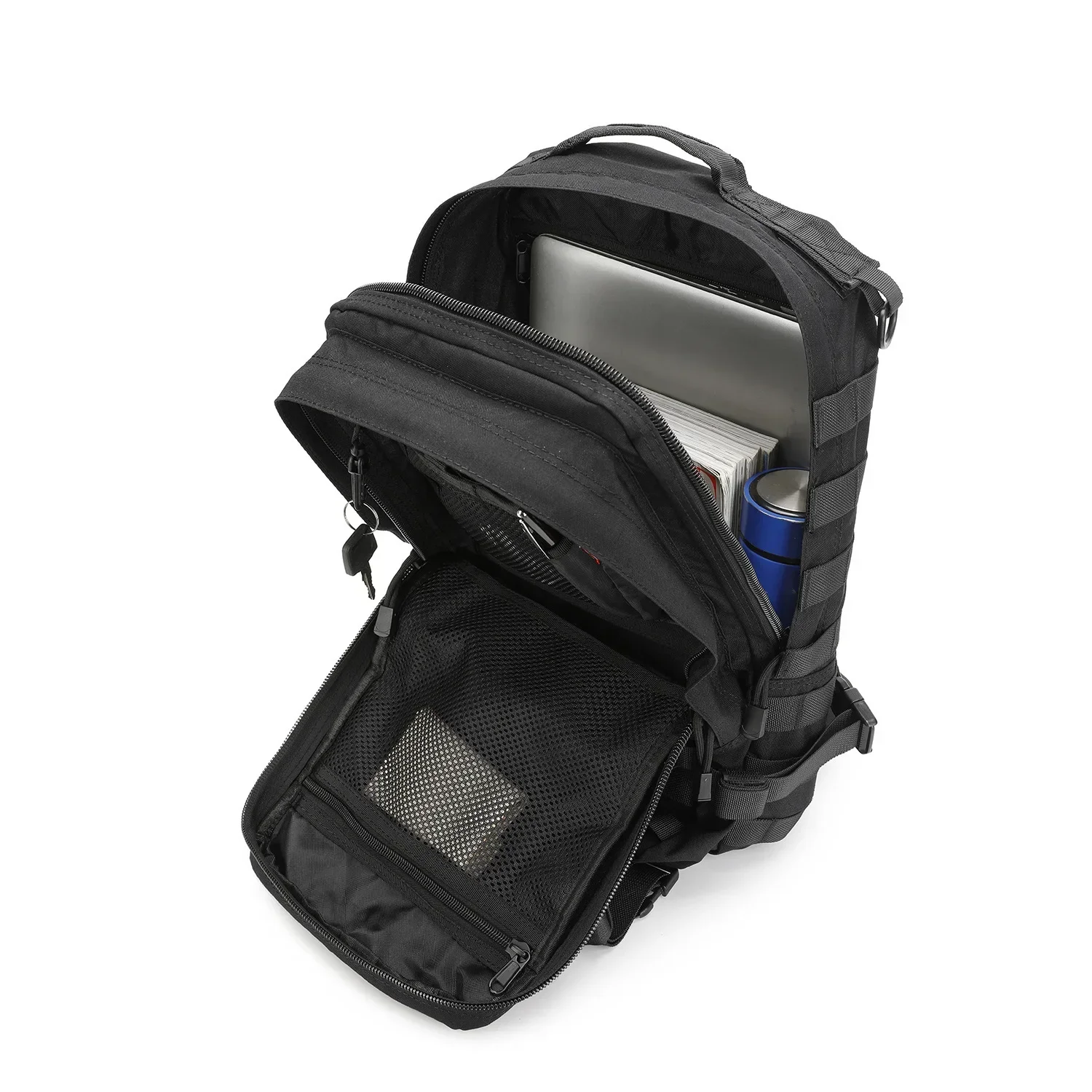 S-shape padded shoulder straps help you spread the load of your backpack in longtime use. Adjustable sternum strap can stabilize your assault backpack.