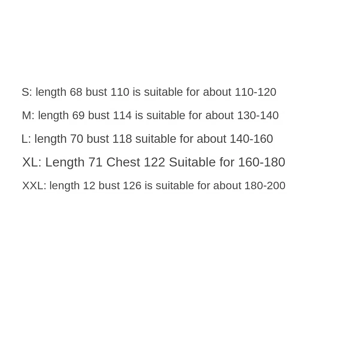 {"sizeInfoList":[{"length":{"cm":"110","inch":"43.31"},"size":"S","vid":-1},{"length":{"cm":"114","inch":"44.88"},"size":"M","vid":-2},{"length":{"cm":"118","inch":"46.46"},"size":"L","vid":-3},{"length":{"cm":"122","inch":"48.03"},"size":"XL","vid":-4},{"length":{"cm":"126","inch":"49.61"},"size":"XXL","vid":-5}]}