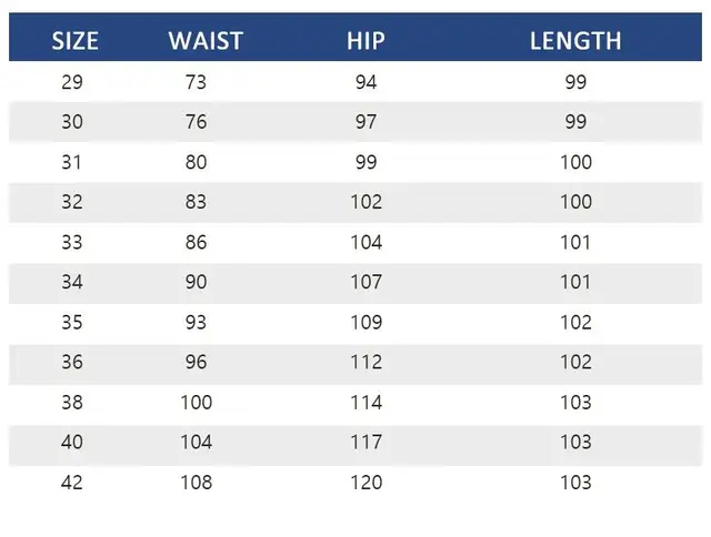 | size_info | {"sizeInfoList":[{"length":{"cm":"73","inch":"28.74"},"size":"29","vid":-1},{"length":{"cm":"76","inch":"29.92"},"size":"30","vid":-2},{"length":{"cm":"80","inch":"31.50"},"size":"31","vid":-3},{"length":{"cm":"83","inch":"32.68"},"size":"32","vid":-4},{"length":{"cm":"86","inch":"33.86"},"size":"33","vid":-5},{"length":{"cm":"90","inch":"35.43"},"size":"34","vid":-6},{"length":{"cm":"93","inch":"36.61"},"size":"35","vid":-7},{"length":{"cm":"96","inch":"37.80"},"size":"36","vid":-8},{"length":{"cm":"100","inch":"39.37"},"size":"38","vid":-10},{"length":{"cm":"104","inch":"40.94"},"size":"40","vid":-45},{"length":{"cm":"108","inch":"42.52"},"size":"42","vid":-47}]} |