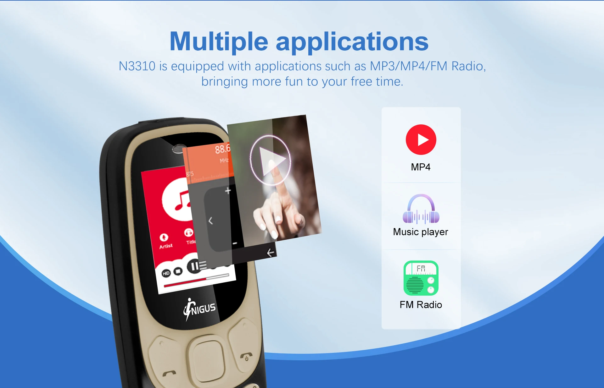 Multimedia : MP3/MP4/FM Radio/Bluetooth/GPRS