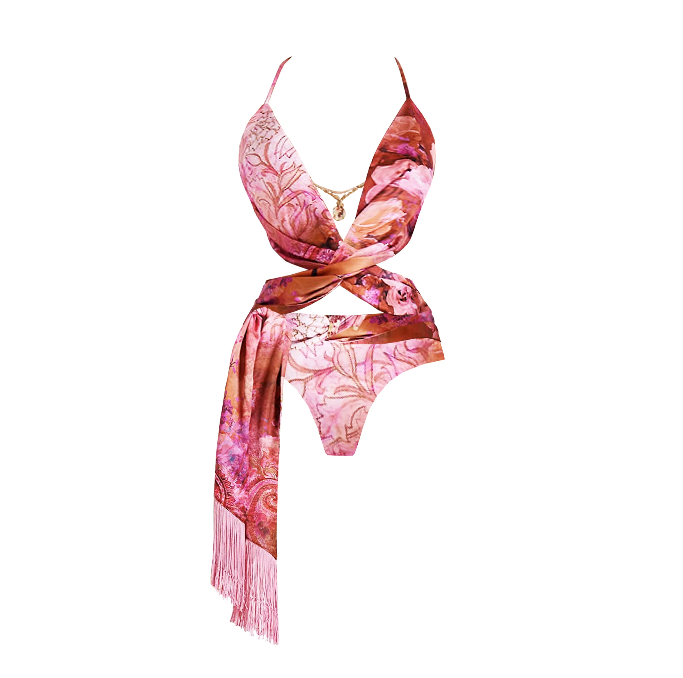 2Pcs Hollow Swimsuit Women Sexy Swimwear With Skirt Floral Bikini Halter Bathingsuit Female V Neck Bodysuit