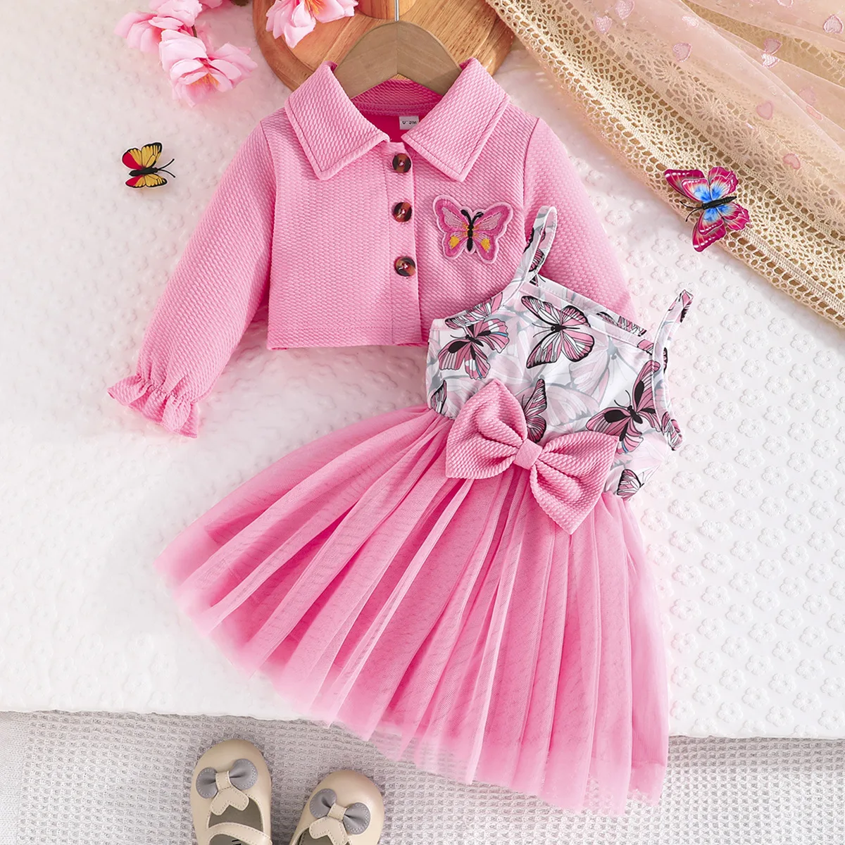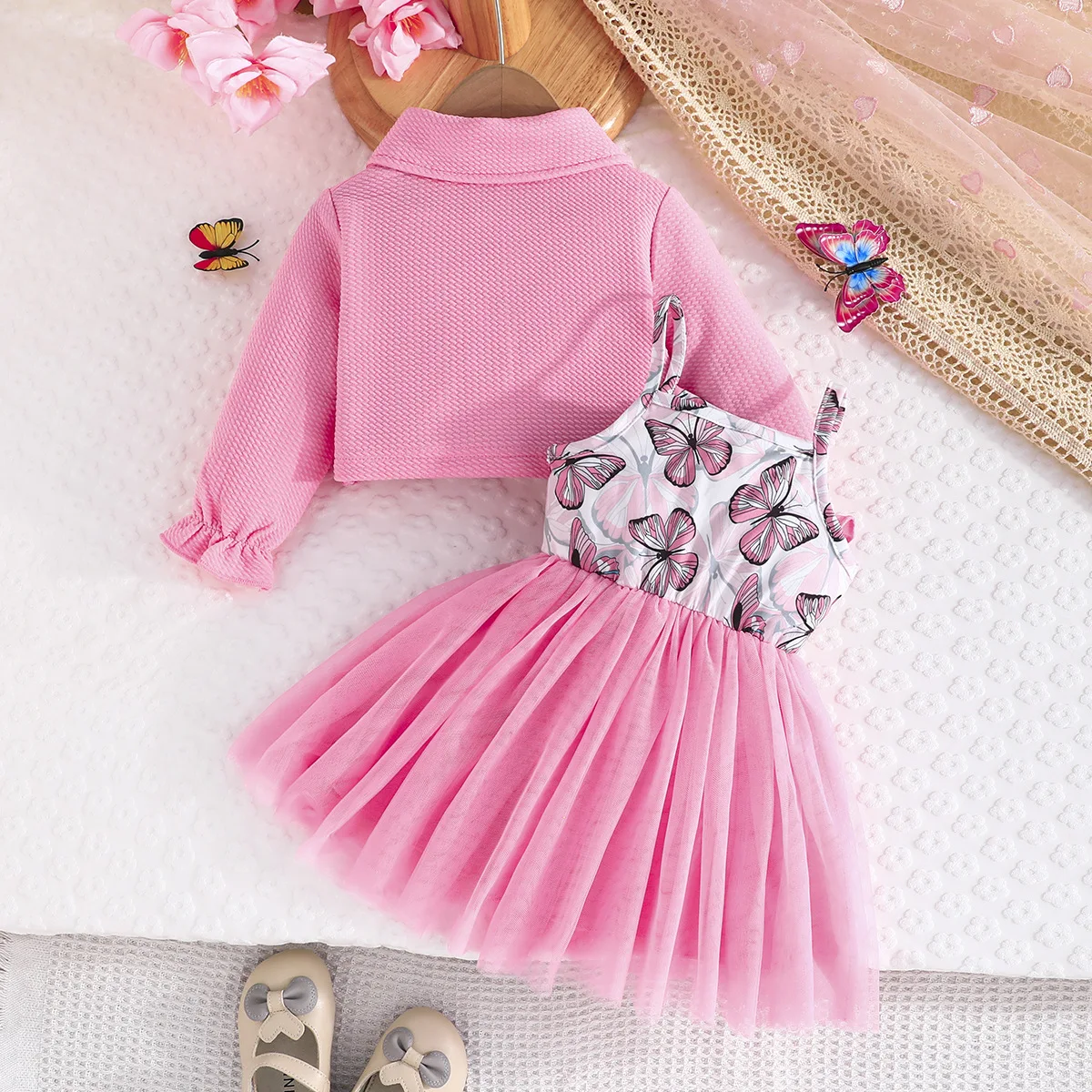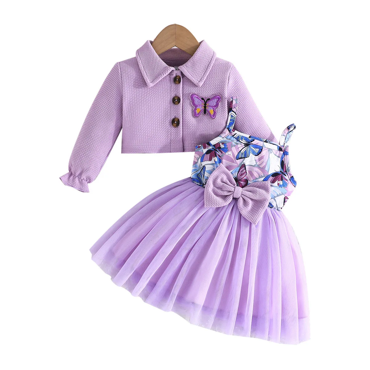 2Piece Sets 2025 Spring Summer Baby Clothes Girl Fashion Butterfly Coat+Print Bow Mesh Dress Toddler