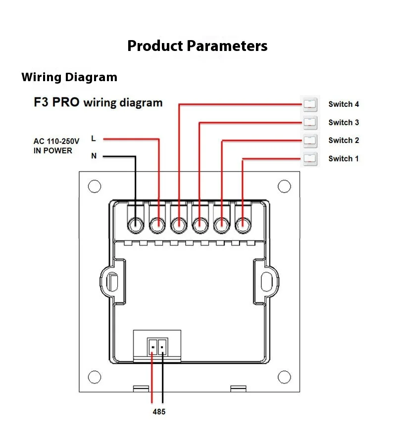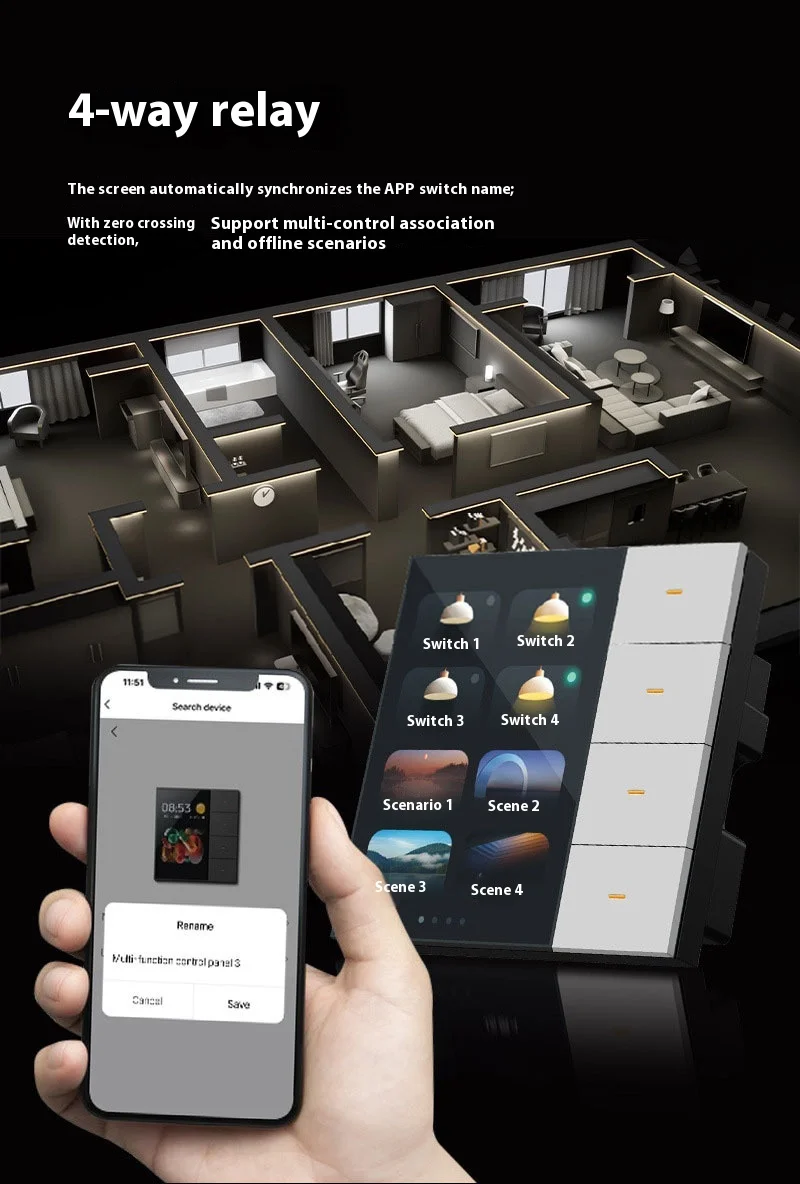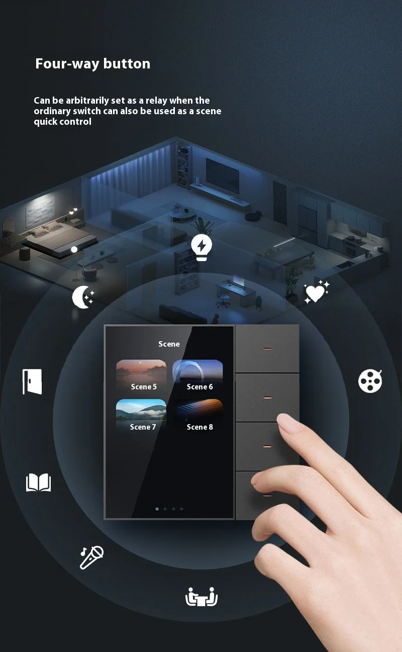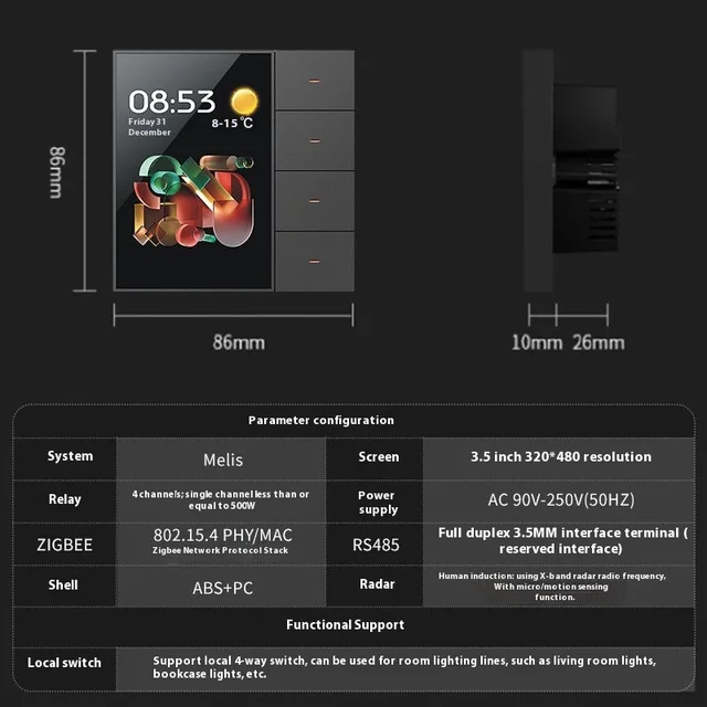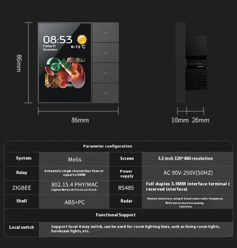 Function introduction: 3.5-inch graffiti multifunctional panel, lighting control, scene control, switch control, curtain control, 4-channel relay
