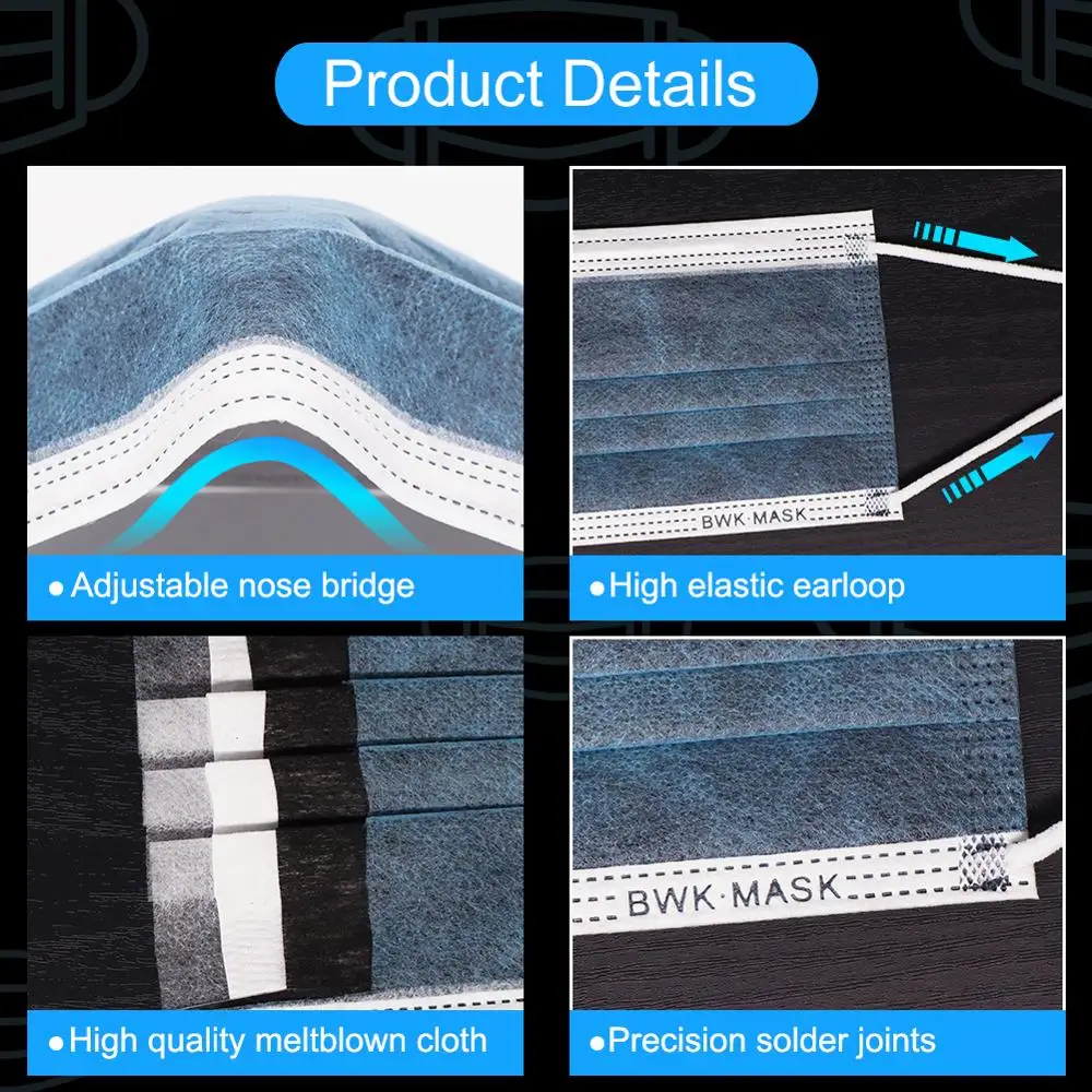 2. Disposable quality face mouth mask, made of 4 ply material. The outer material is Waterproof non-woven fabric, the middle layer material is melt-blown material which can effectively filter, the inner material Is soft non-woven fabric which can absorb the moisture of body’s expiration to keep our skin dry.