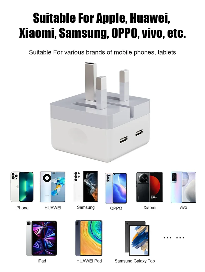 4. Dual PD charger, compatible For Samsung Huawei Xiaomi and other mobile phone charging, supporting high-power output current.