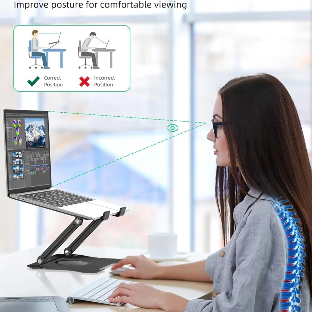 4. Ergonomic design: You can freely adjust the height and angle of the laptop bracket to reach the perfect eye level, which helps reduce shoulder and neck pain. Whether you sit or stand, it ensures you are in a comfortable position.