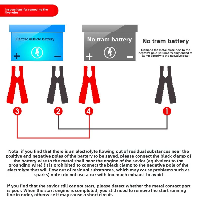(1) Firstly, clamp the red wire of the starting line onto the positive pole of the red battery of the “rescued vehicle”.