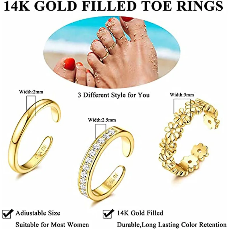 • ✨【GREAT FOR GIFTING】14K gold filled toe rings are perfect summer jewelry for any occasion, casual to formal. Beautiful toe rings will make you charming and fashion on beach party, summer cocktail party, dating, wedding, poolside or daily wear. Perfect foot jewelry gift for women on birthday, mother’s day, christmas, tourist, etc.
