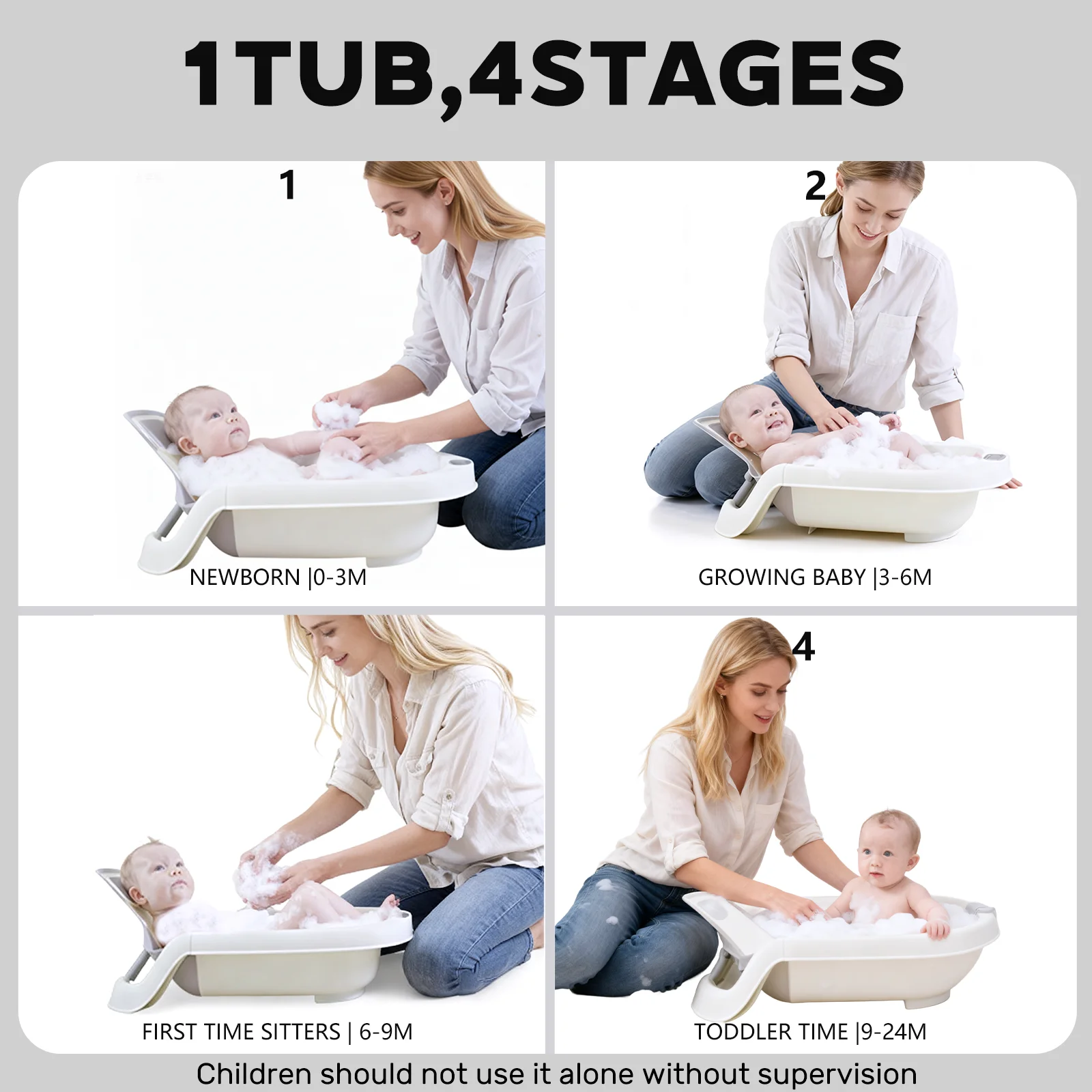 🌟 4-Stage Grow-With-Me Design: Perfect from newborn to toddler (0-24 months)! This convertible tub adapts across 4 stages (0-3m, 3-6m, 6-9m.9-24m) to comfortably support your baby up to 25 lbs.