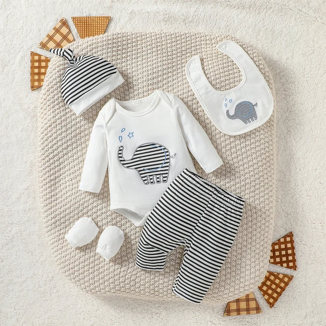 4Pcs Baby Boy’s all seasons Full Cartoon Elephant Streetwear Fashion Pantsuit +Hat +Gloves+Bib