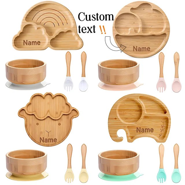 4pcs Bamboo Plate Sets Customized Baby Feeding Bowl Car Cloud Shaped Plate Spoon Fork Tableware Suction