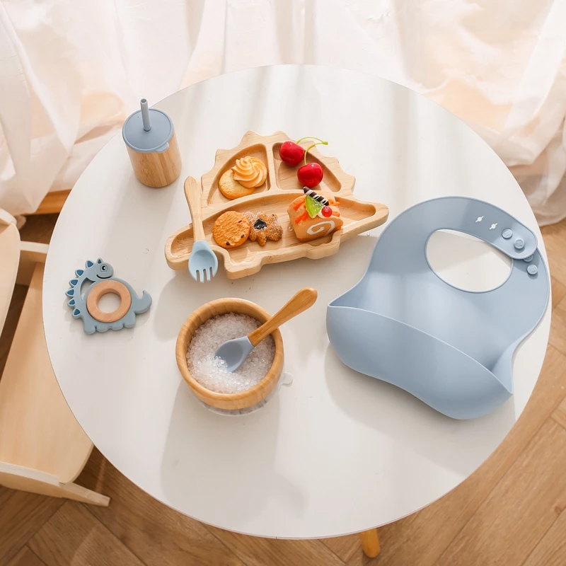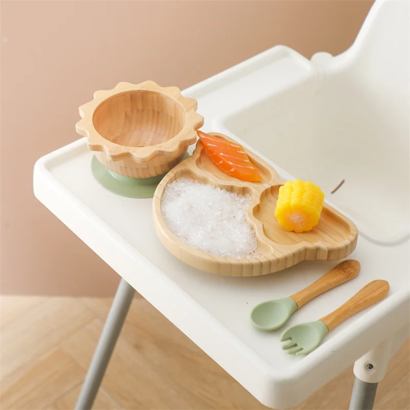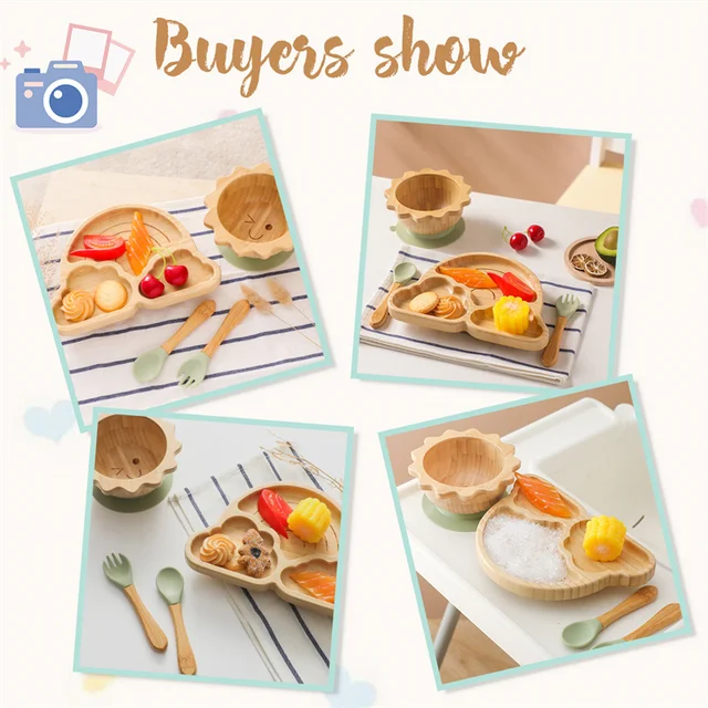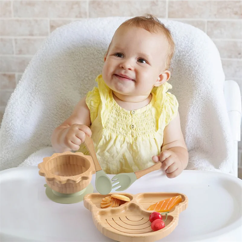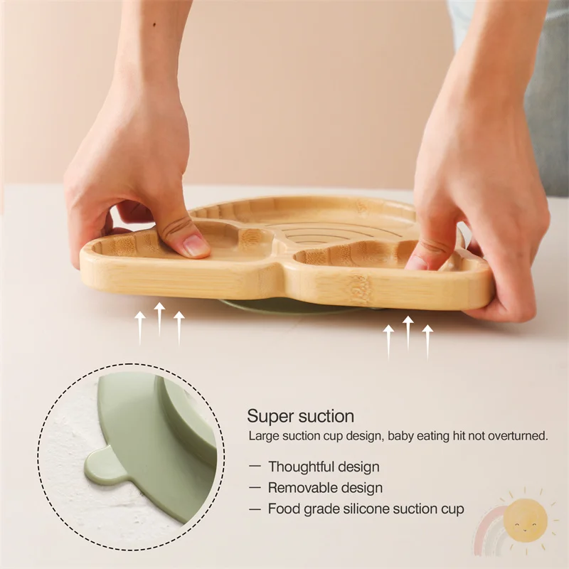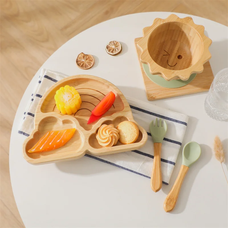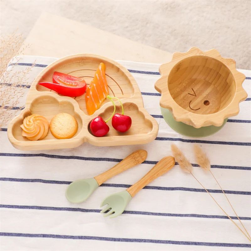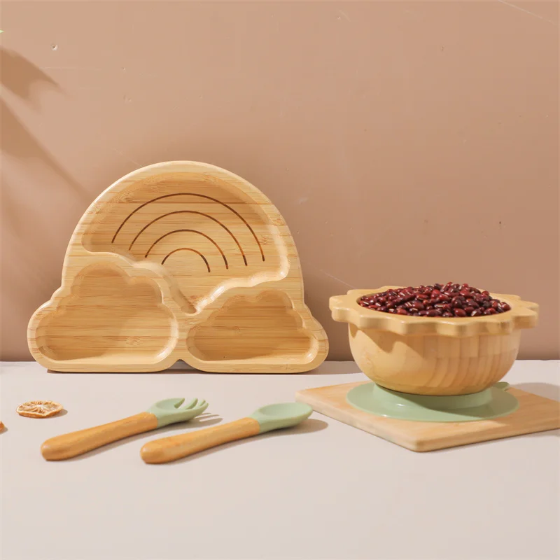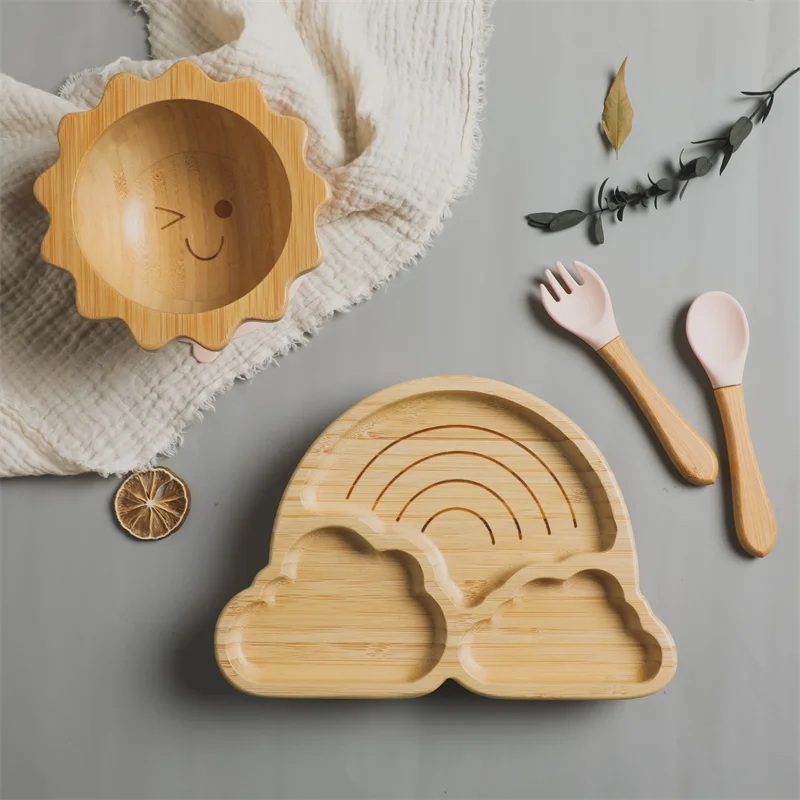 4pcs Bamboo Wood Sun Bowl Rainbow Clouds Plate Feeding Supplies Children Tableware Suction Plate Bowl