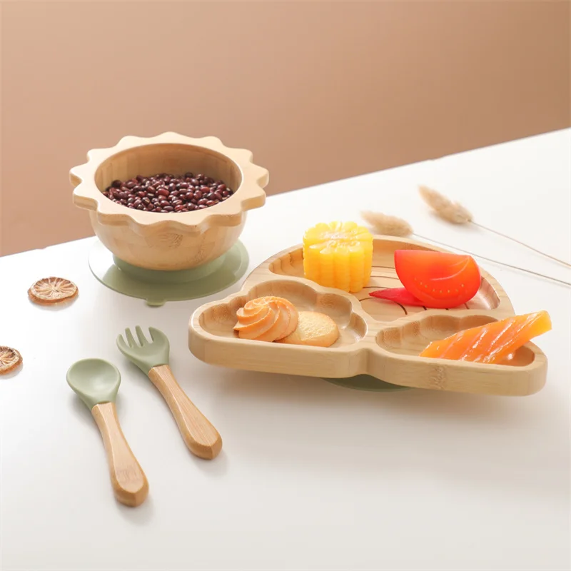 4pcs Bamboo Wood Sun Bowl Rainbow Clouds Plate Feeding Supplies Children Tableware Suction Plate Bowl Baby Newborn Accessories