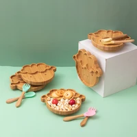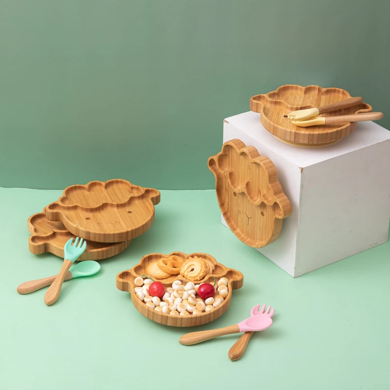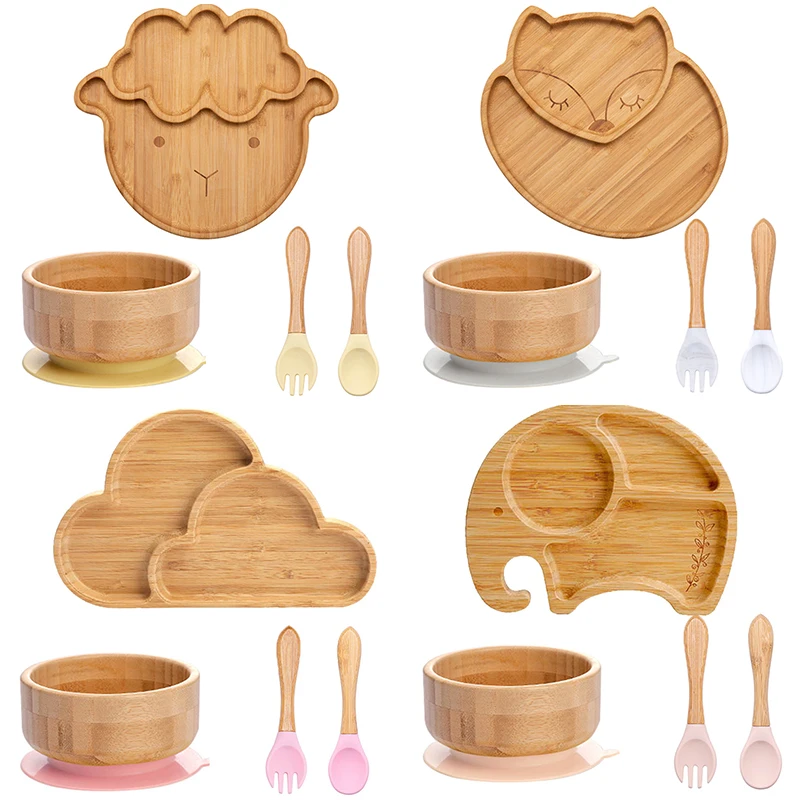 4pcs Children’s Tableware Suction Plate Bowl Baby Dishes Baby Feeding Dishes Spoon Fork Sets Bamboo Plate for Kids Tableware