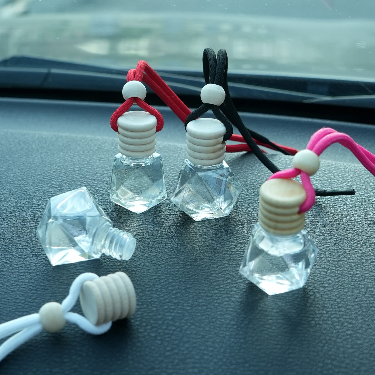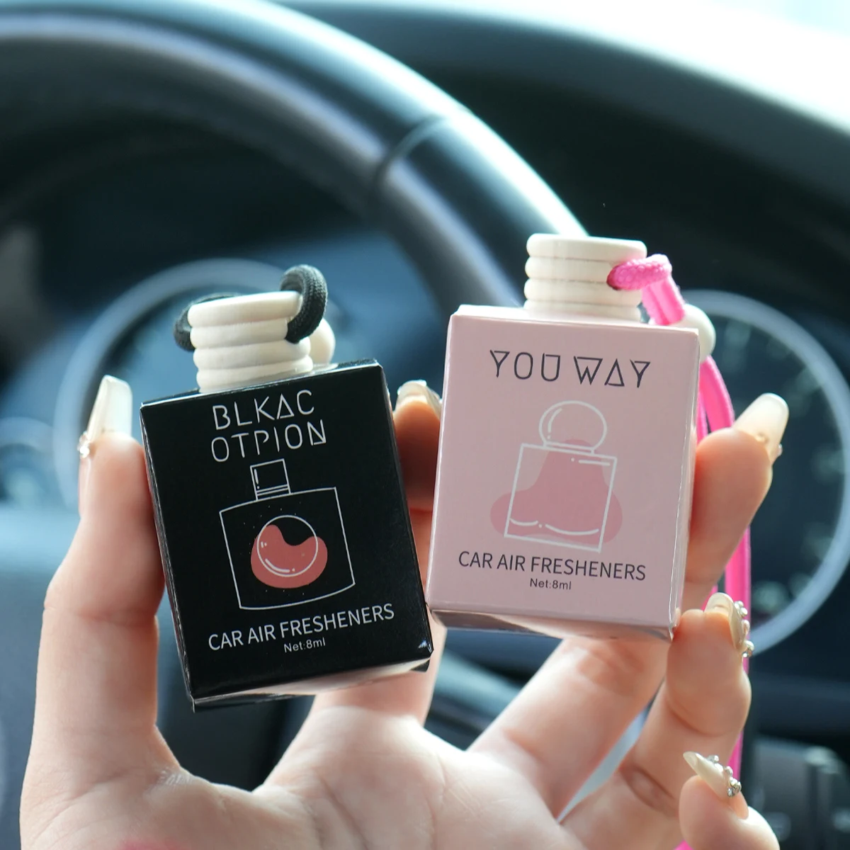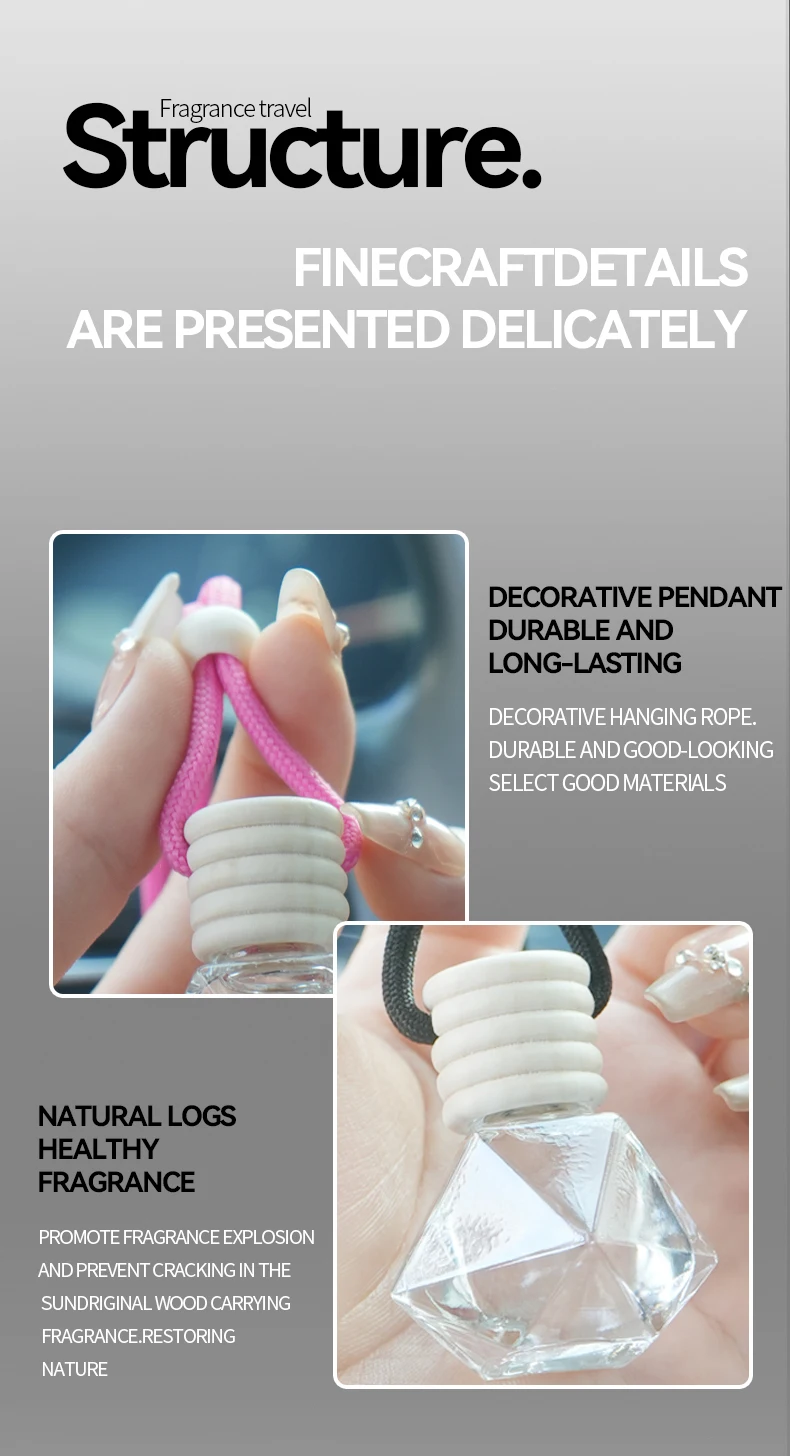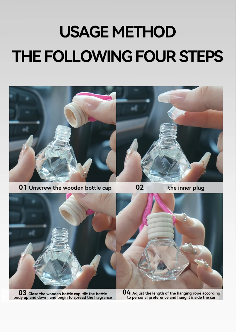 Unscrew the wooden cover, remove the inner plug, and tighten thewooden cover; Pour the bottle up anddown for 2-3 seconds to allowthe aromatherapy liquid tosoak into the wooden lid; Adjust thenanging rope to theappropriate length and install it under therearview mirror todisperse the fragrance; if you feel theweakeningduring use,you can pour it up and down again