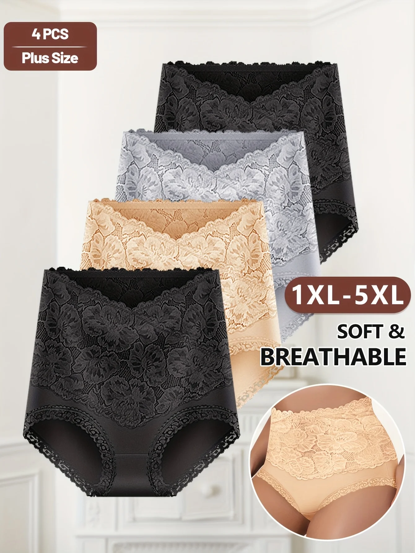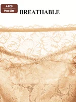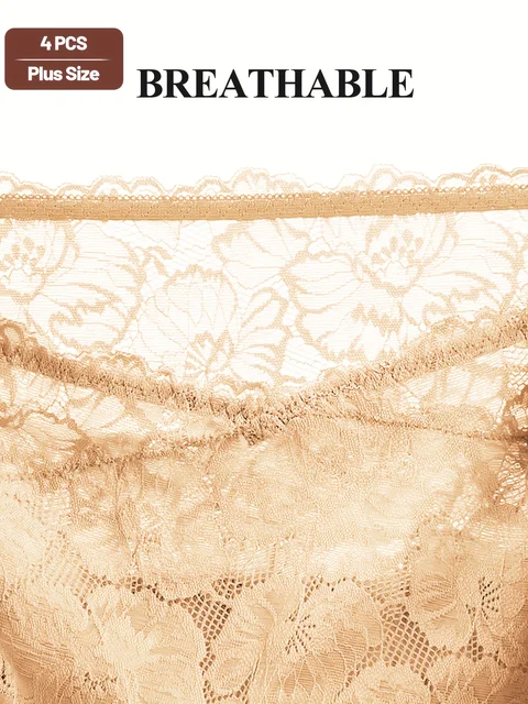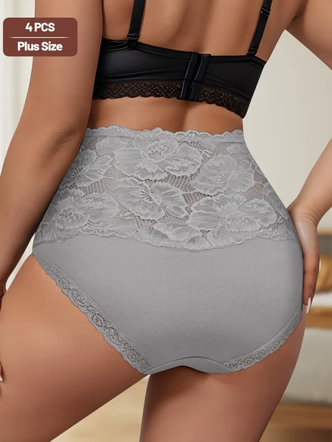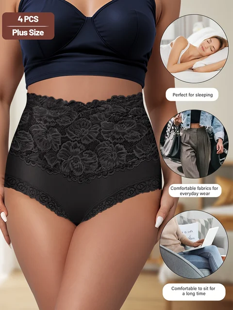 4pcs Women’s High-Waisted Tummy Control Underwear – Plus Size Soft Breathable Lace Trim Hip-Hugging