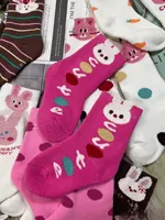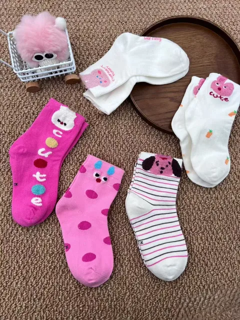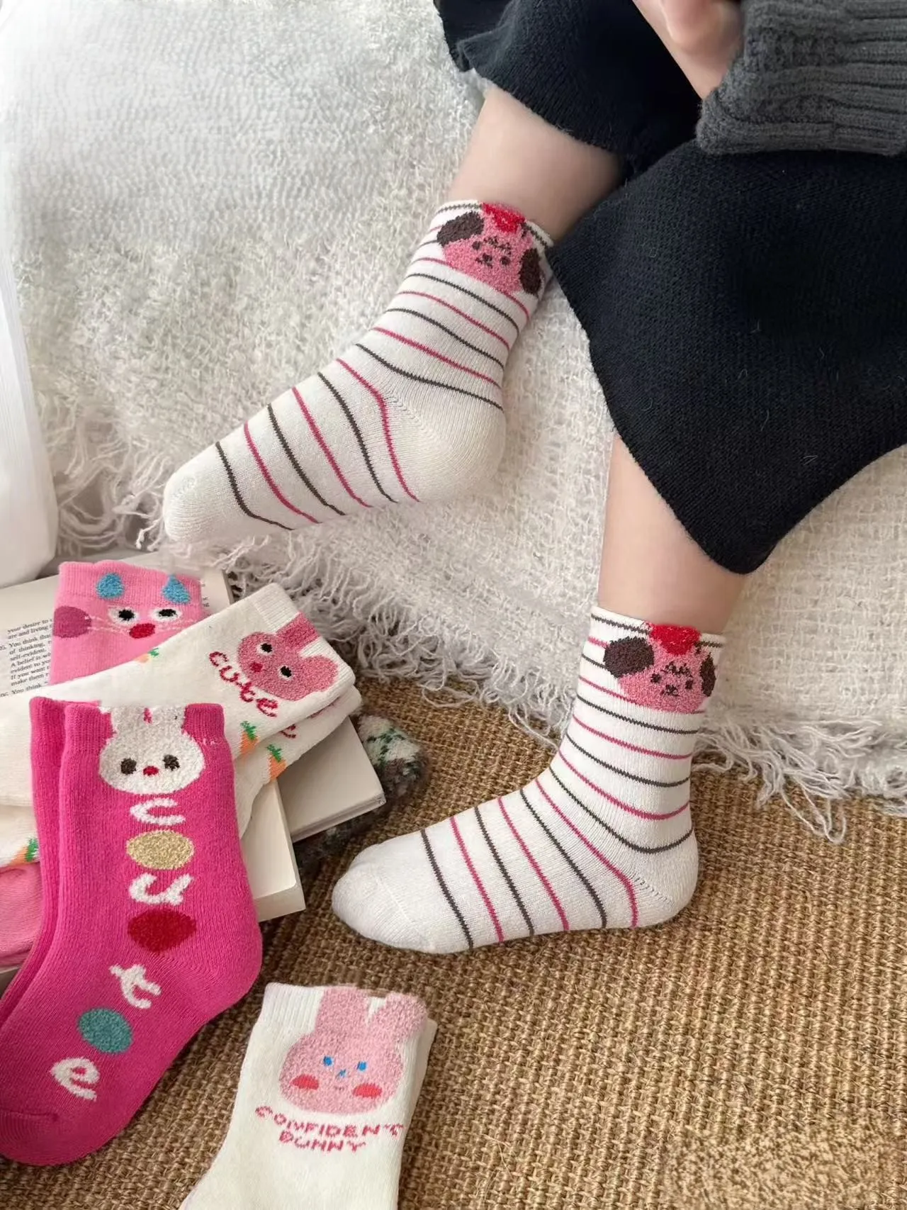 The charming pink and white socks are embroidered with cute letters and cartoon rabbits, which add sweetness, warmth and cuteness to any costume.