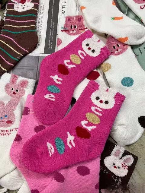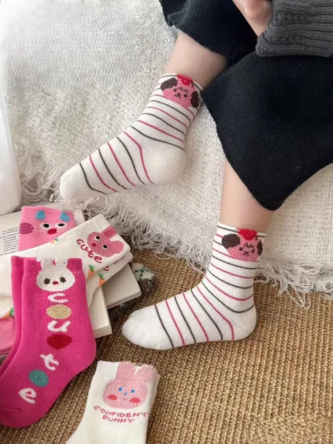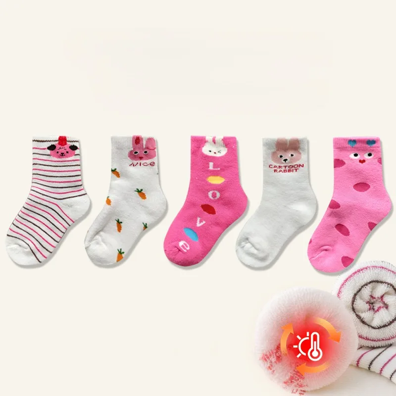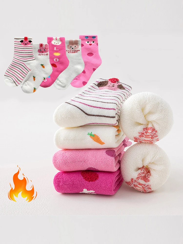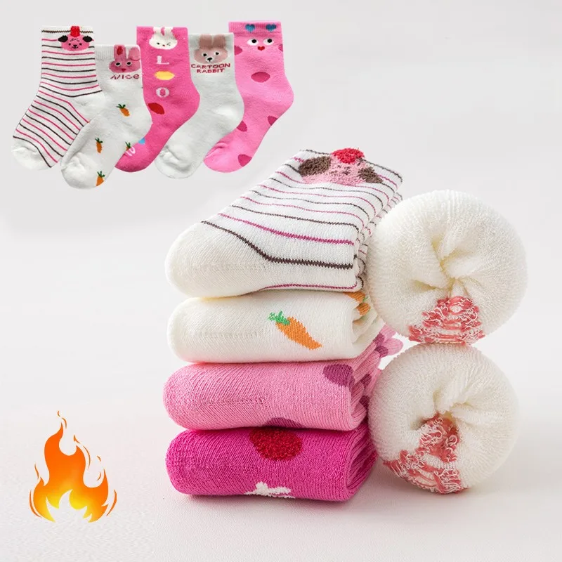 5 pairs of cute children's warm socks with thick lamb fleece lining for autumn and winter, featuring an adorable pink bunny desi