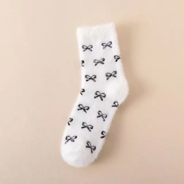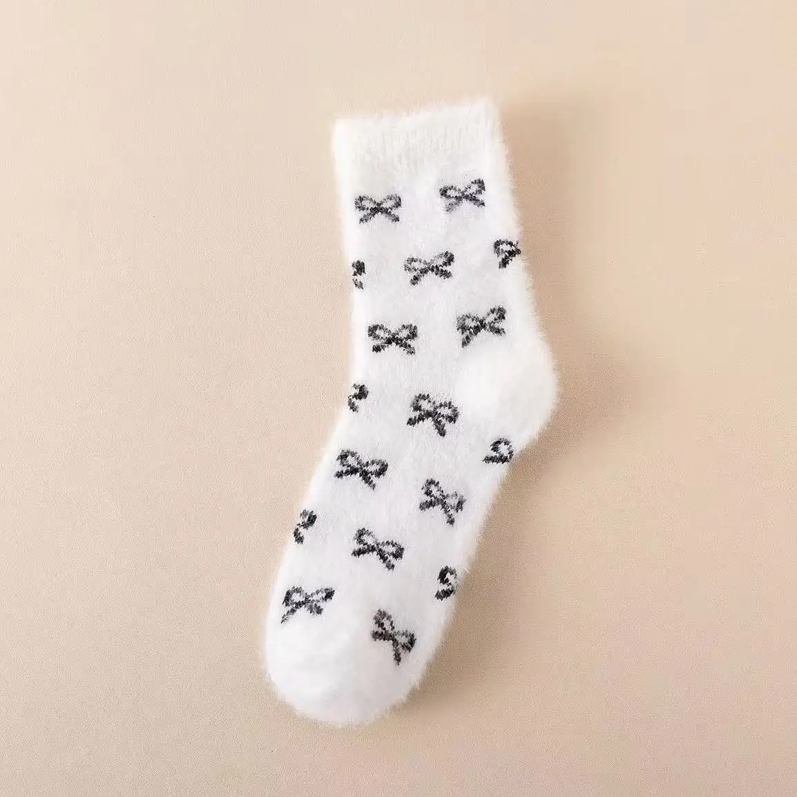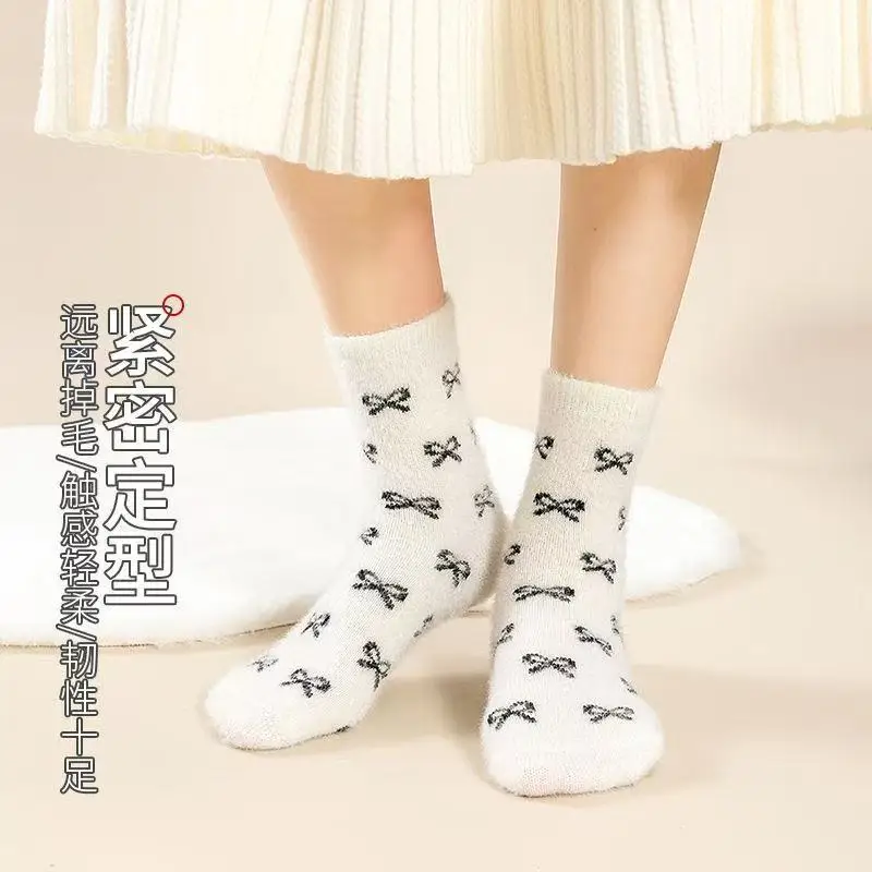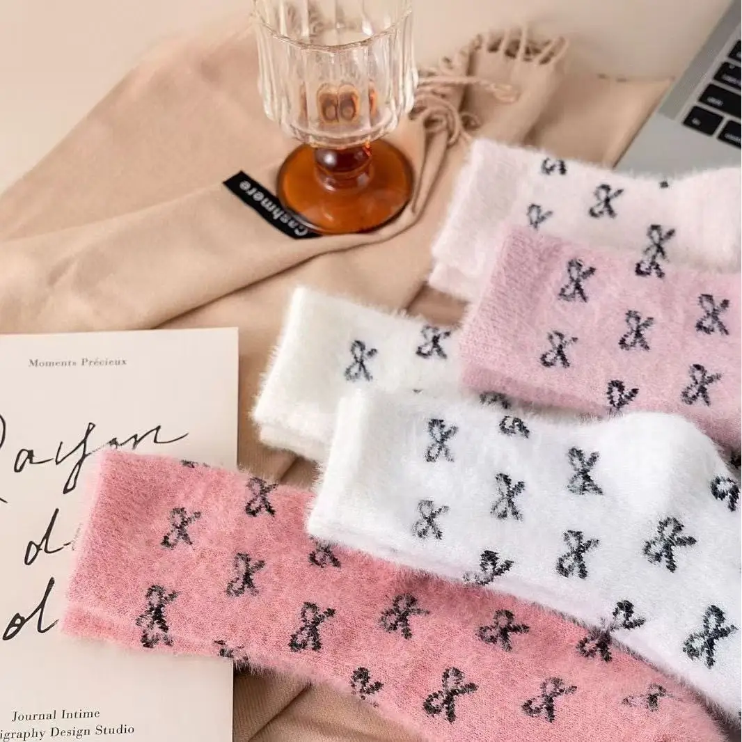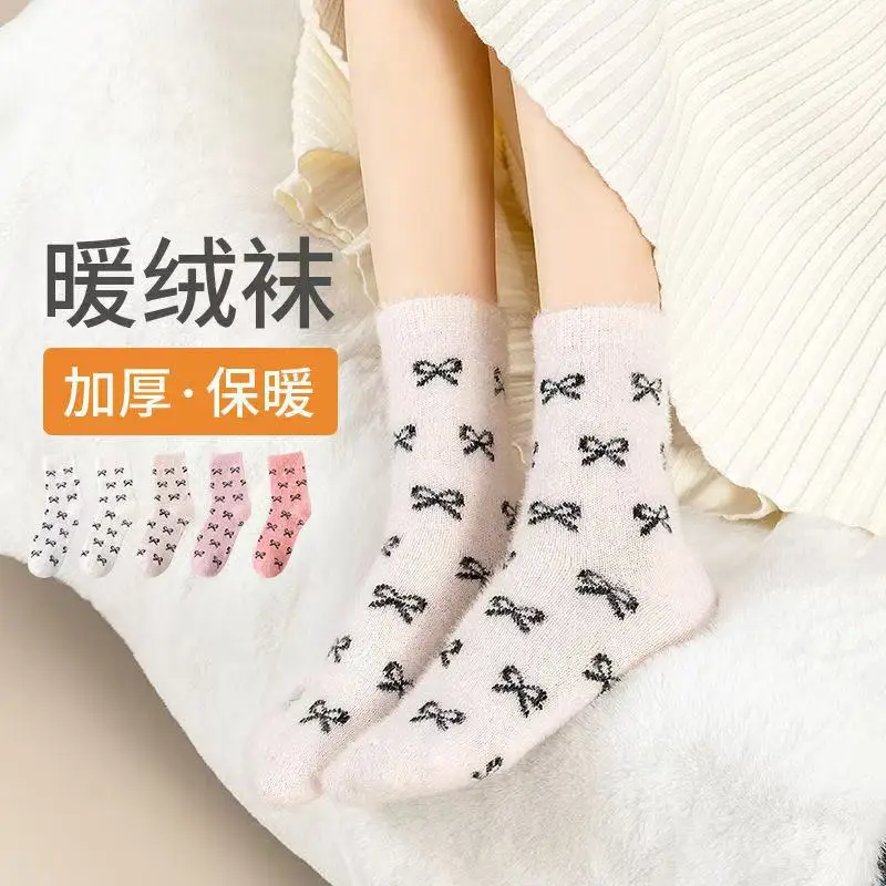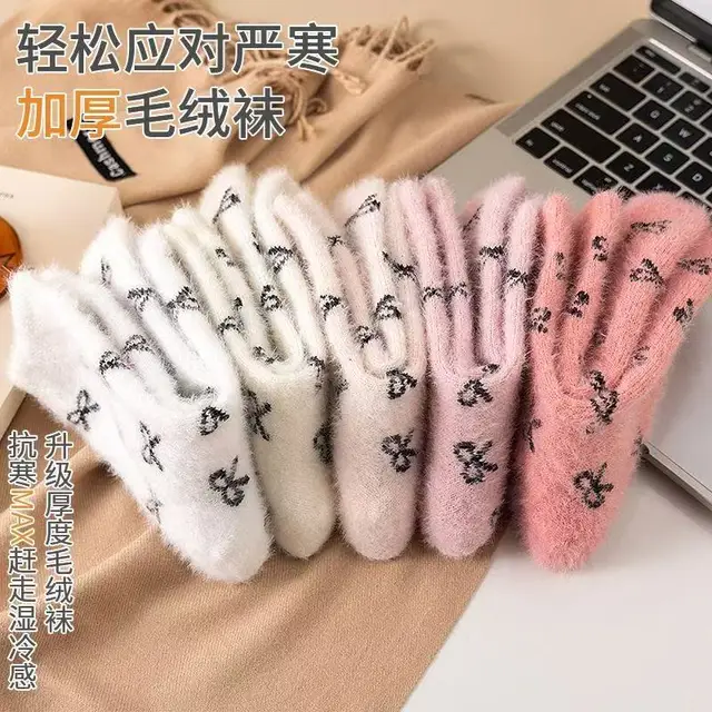5 Pairs Socks Autumn Winter Pink Mink Fleece Women mid-calf Thick fluffy Comfortable Home Postpartum Bow Sports Ankle Crew 8W266