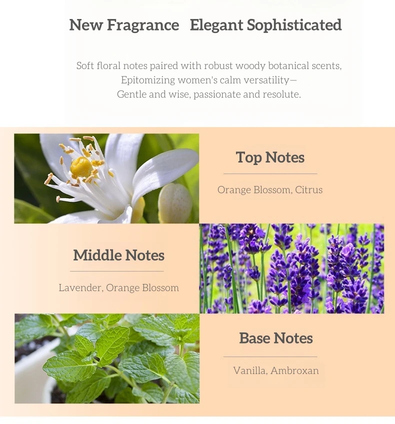 Soft floral notes paired with robust woody botanical scents,Epitomizing women’s calm versatility-Gentle and wise, passionate and resolute.