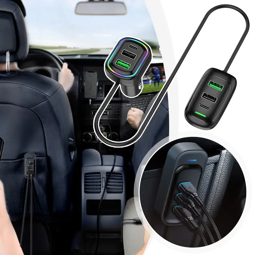 6-Ports Car Charger USB Type-C Front And Rear Extension With RGB Light PD Fast Charging Power Adapter For Iphone Tablet Laptop
