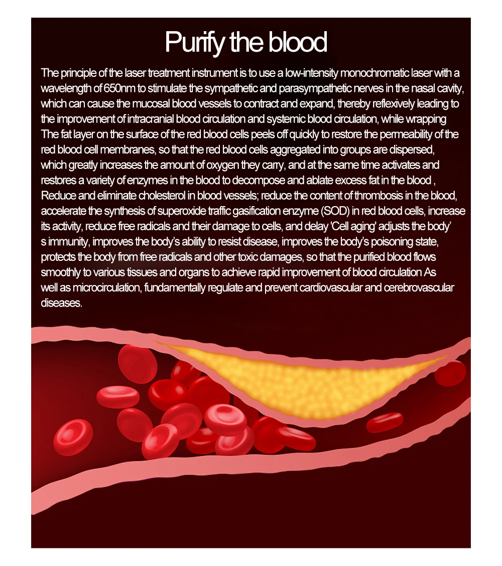 It helps to enhance the deformability, and improve the aggregation of red cells and blood platelet when light quantum penetrates blood, thus separating the gathered red cells, decreasing the blood viscosity, enhancing the oxygen-carrying capacity, and accelerating the entire body’s blood circulation.