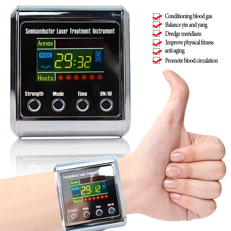 The LLLT Watch is slightly larger than a wristwatch and it is applied to the wrist, where simultaneous and continuous acupuncture points or blood irradiation using laser light can be performed.