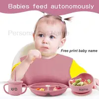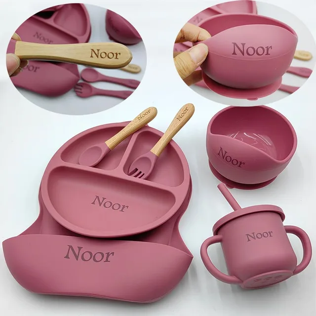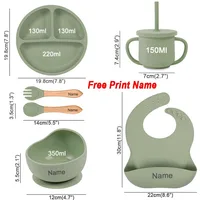 6Pcs Silicone Tableware For Kids Baby Feeding Sets Sucker Bowl Dining Plate Spoon Fork Bib Feeding Cup Personalized Name Children’s Gift