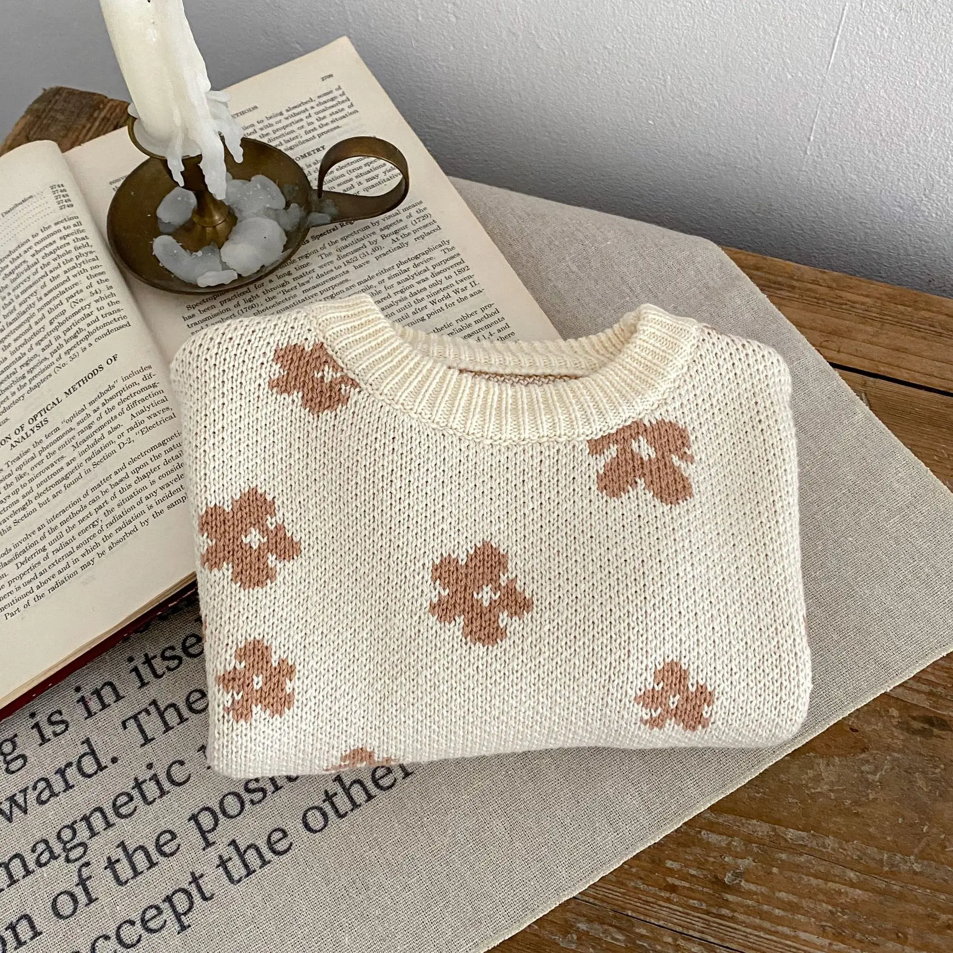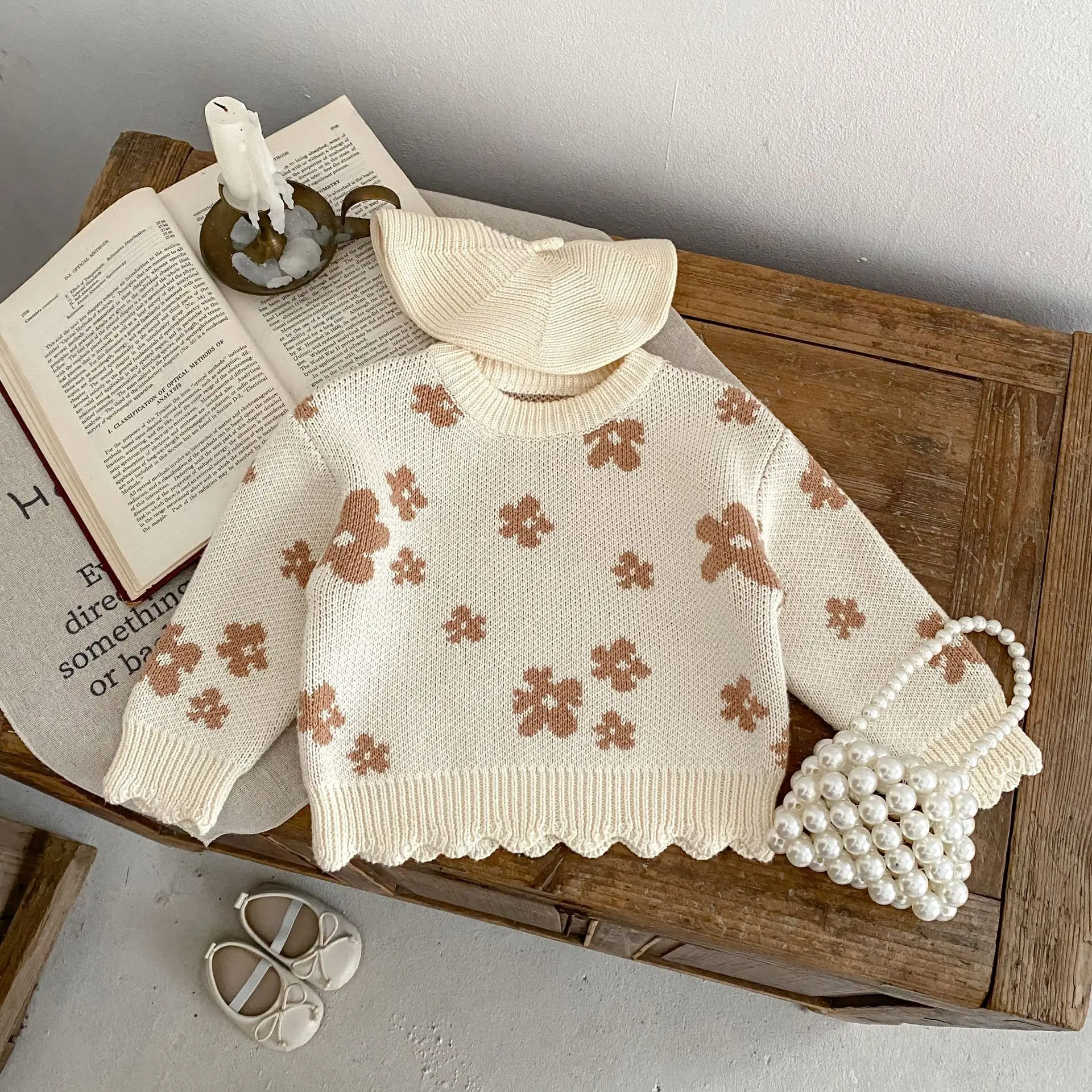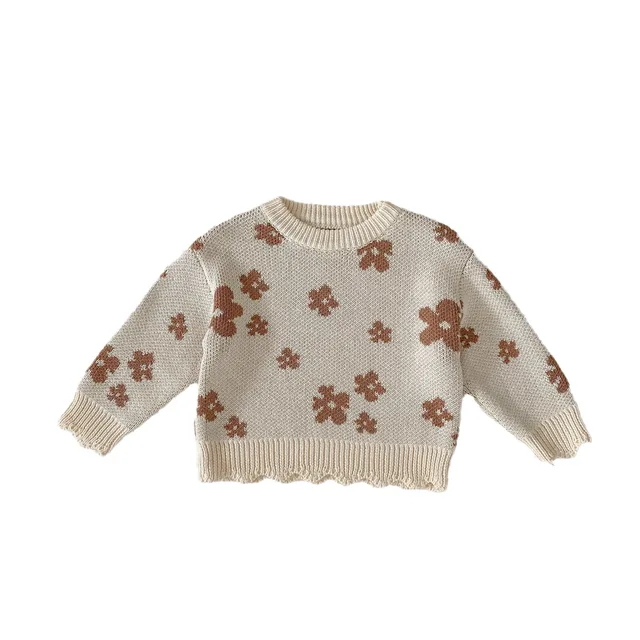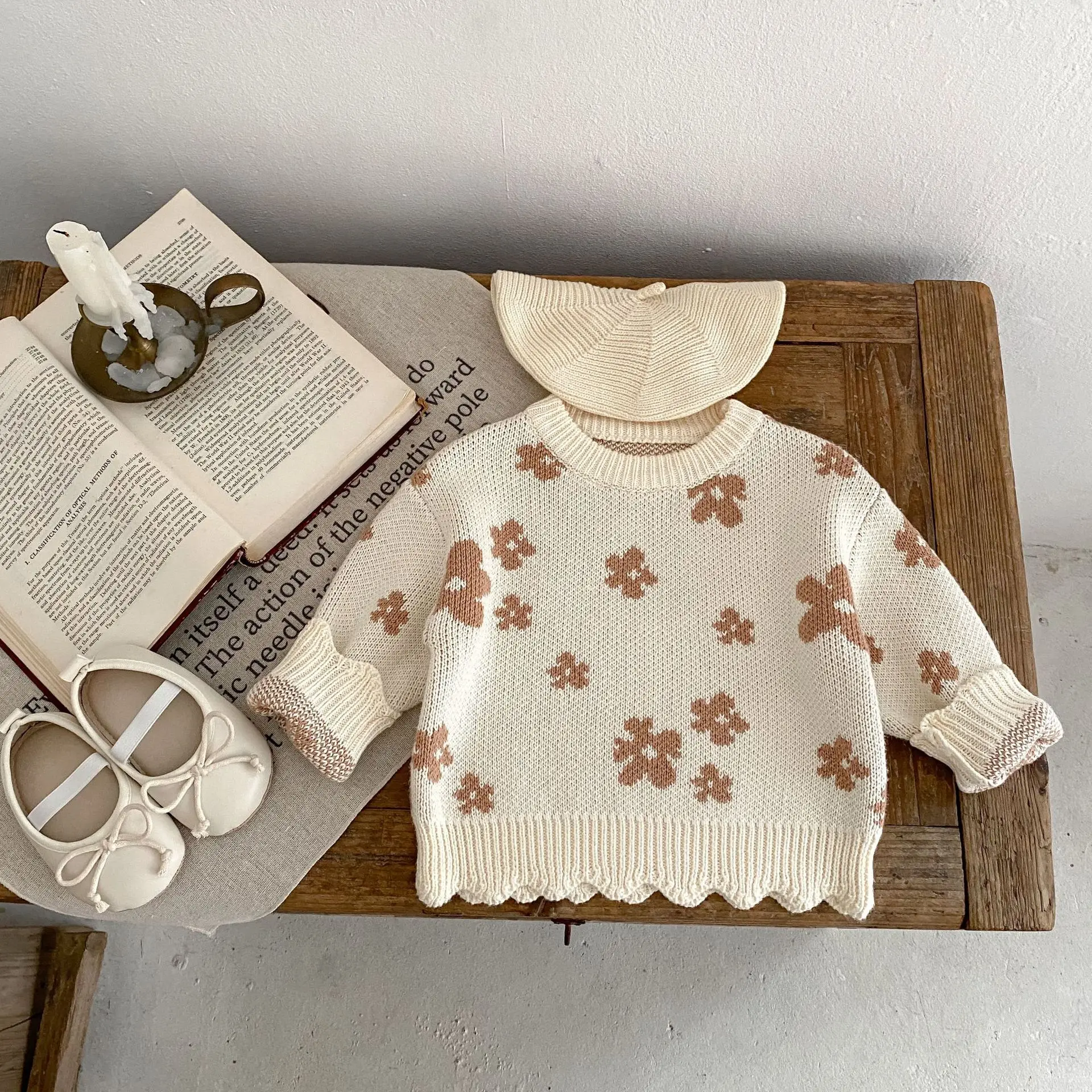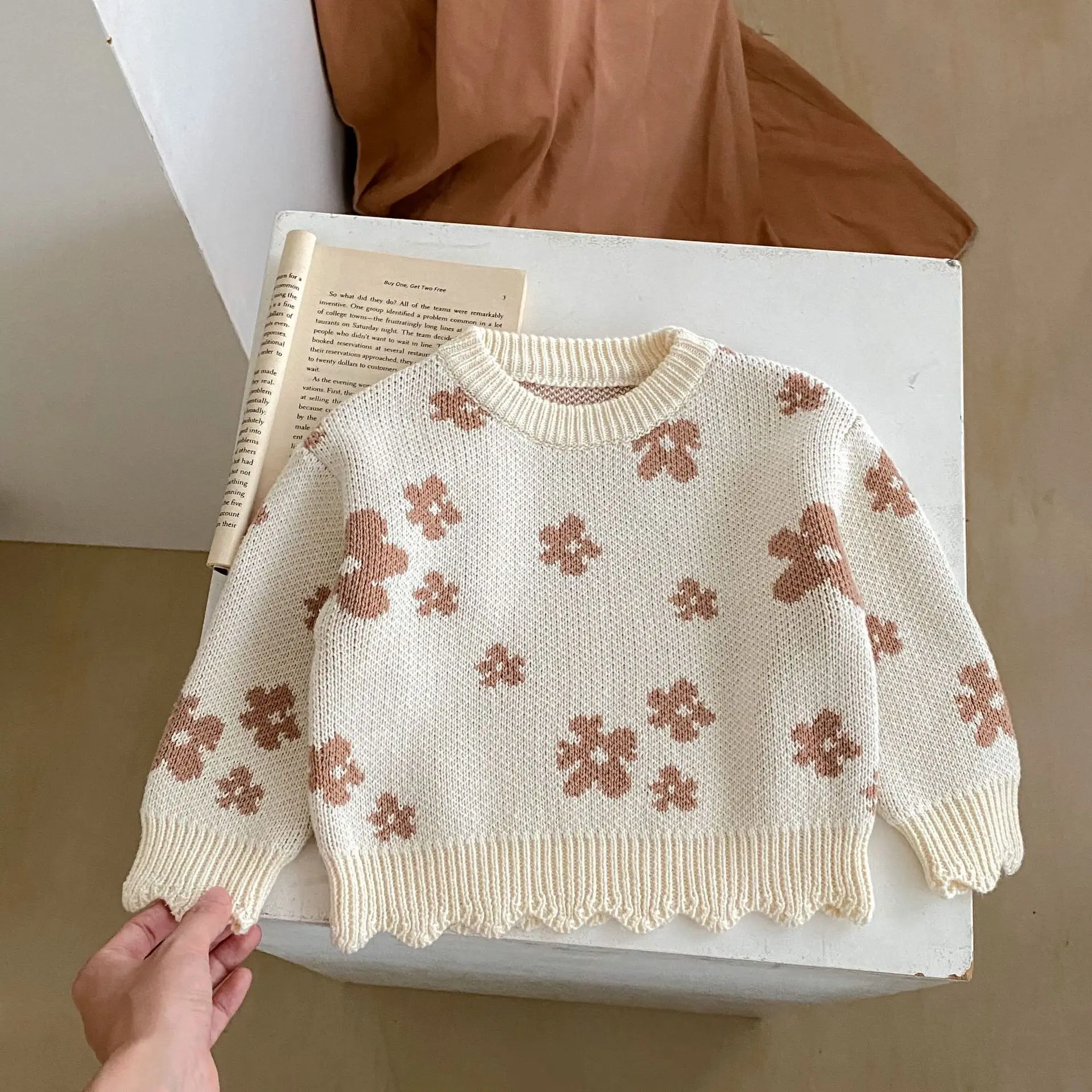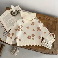 Autumn/Winter New Arrival Girls' Round Neck Floral Knit Sweater – Cozy Pullover Top for Toddlers and Kids