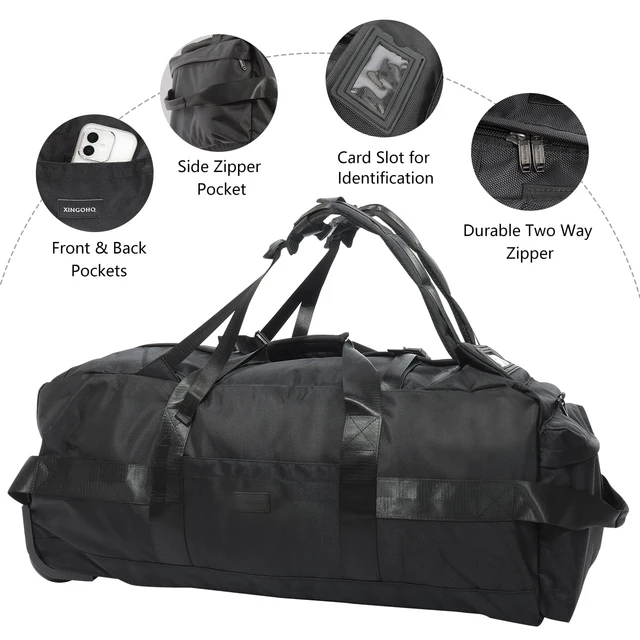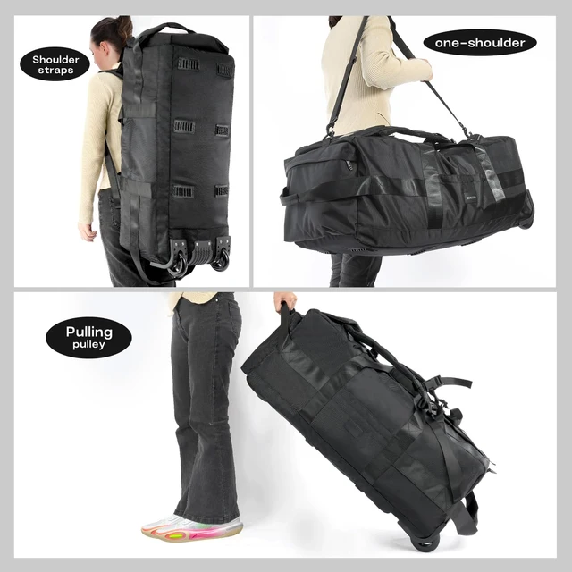 1. Multi-Purpose Rolling Duffle Bag with Wheels: Designed for versatile travel needs, this heavy-duty wheeled duffel bag converts to a backpack with adjustable shoulder straps, perfect for camping trips, gym sessions, and weekend adventures.