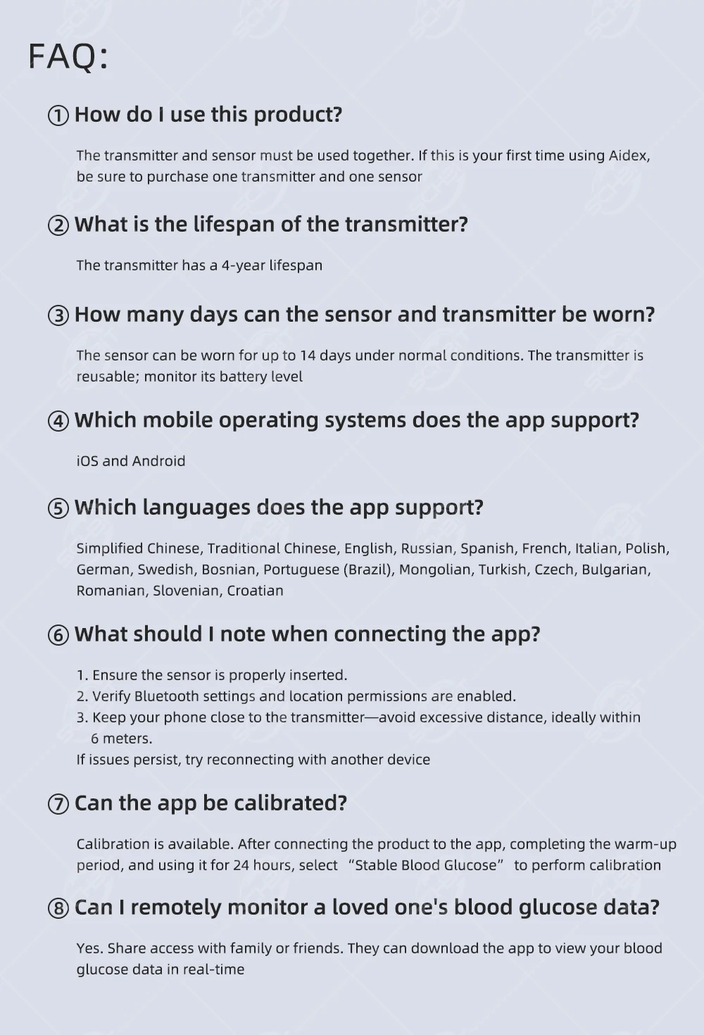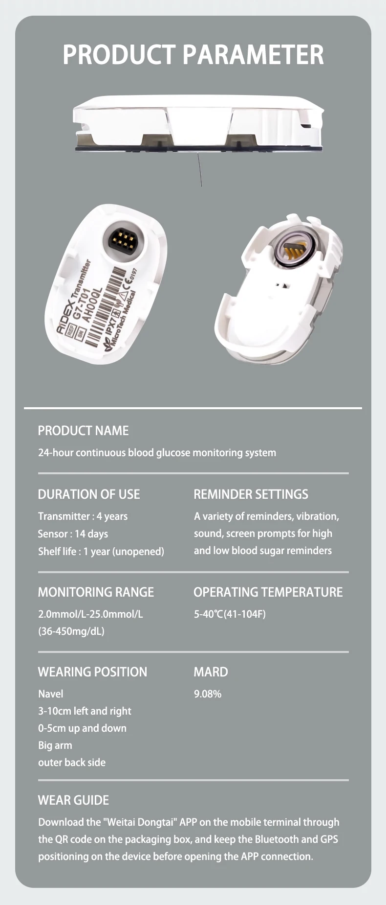 The transmitter can be used for 4 years after being turned on, the sensor can only be used for 14 days after being turned on. The transmitter can be reused and does not require charging. Please do not discard the transmitter after use.